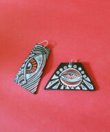 These earrings are handcrafted from upcycled Desserto cactus leather scraps, giving them a unique and edgy look while promoting sustainability. Adorned with a striking Evil Eye print in vibrant red and white colors, they truly stand out. The hooks are made from high-quality 925 silver, ensuring both style and durability.