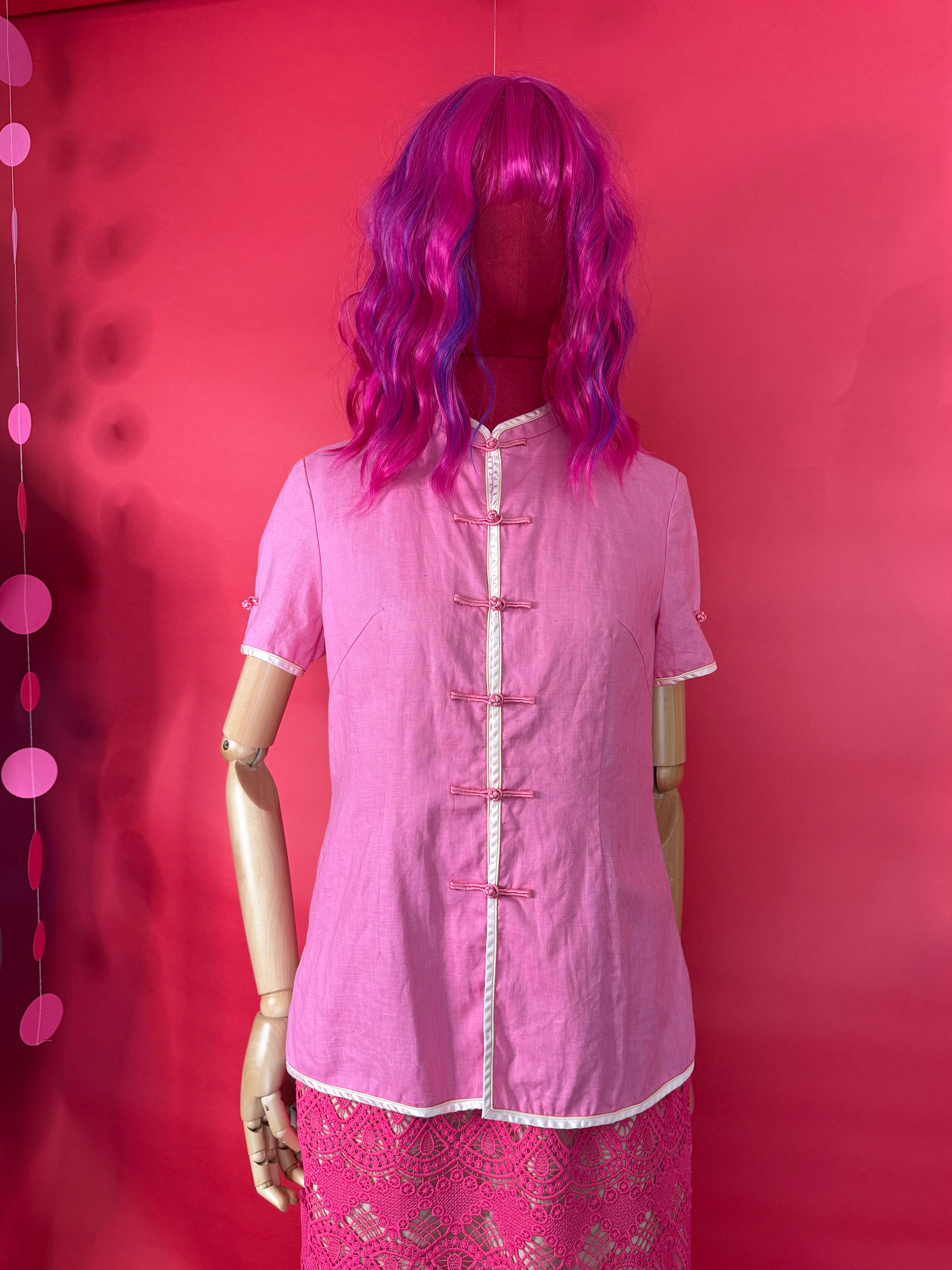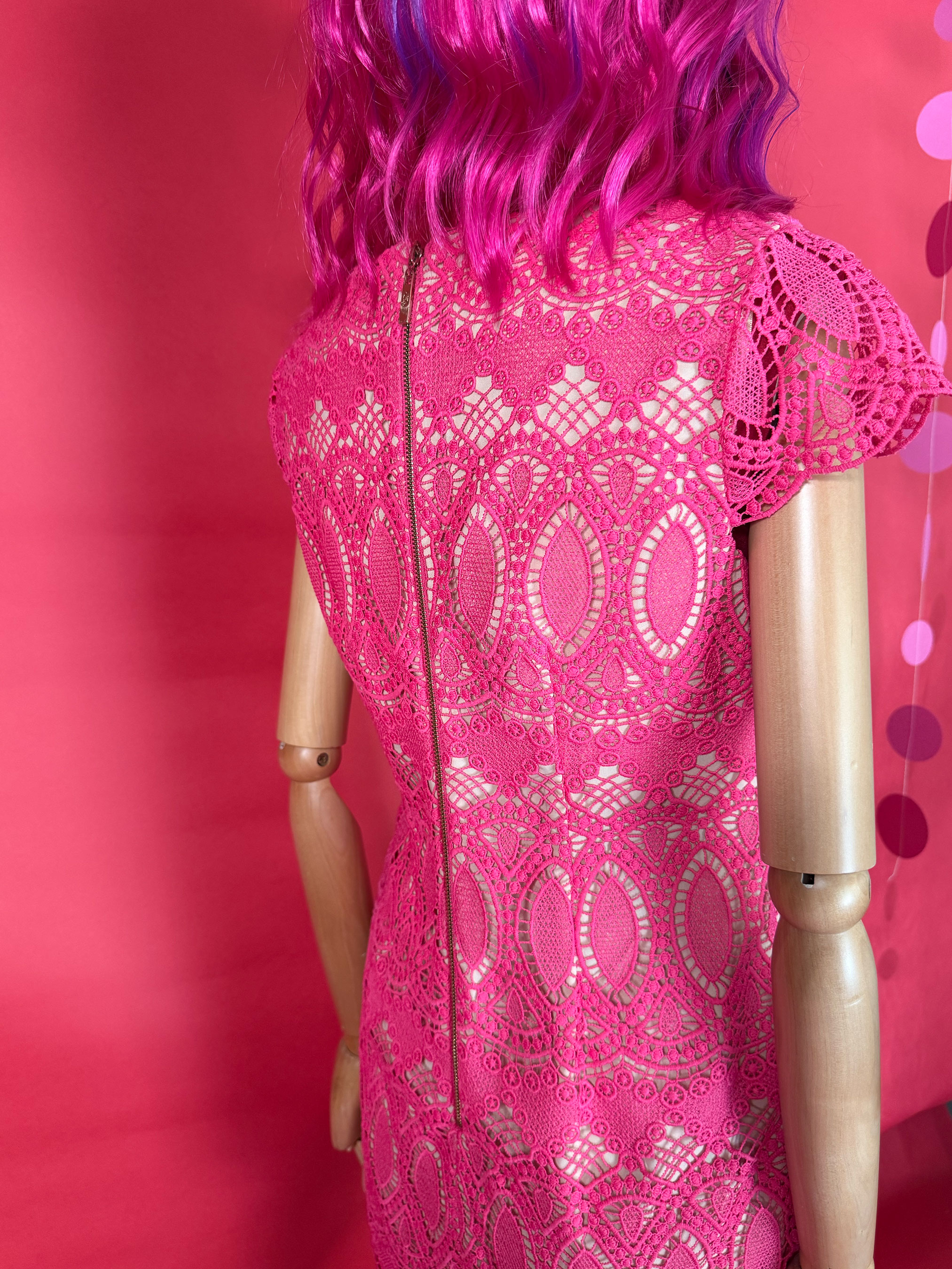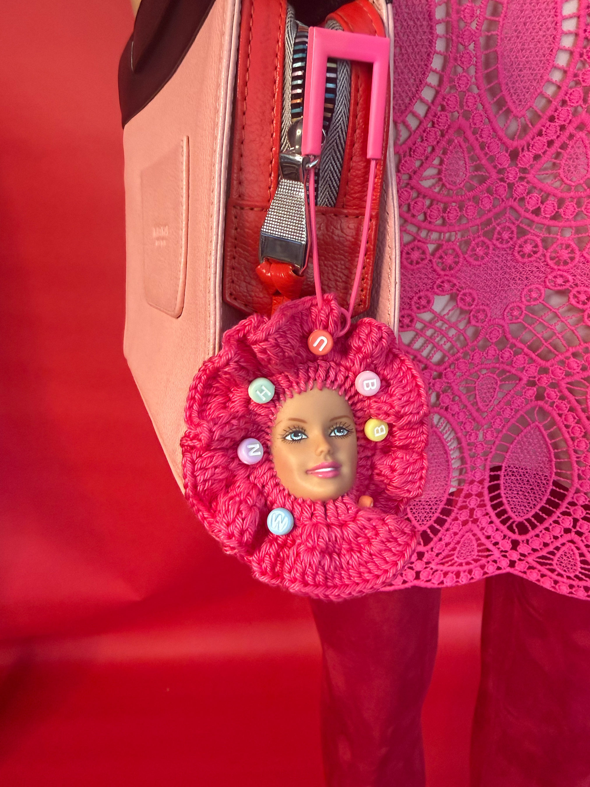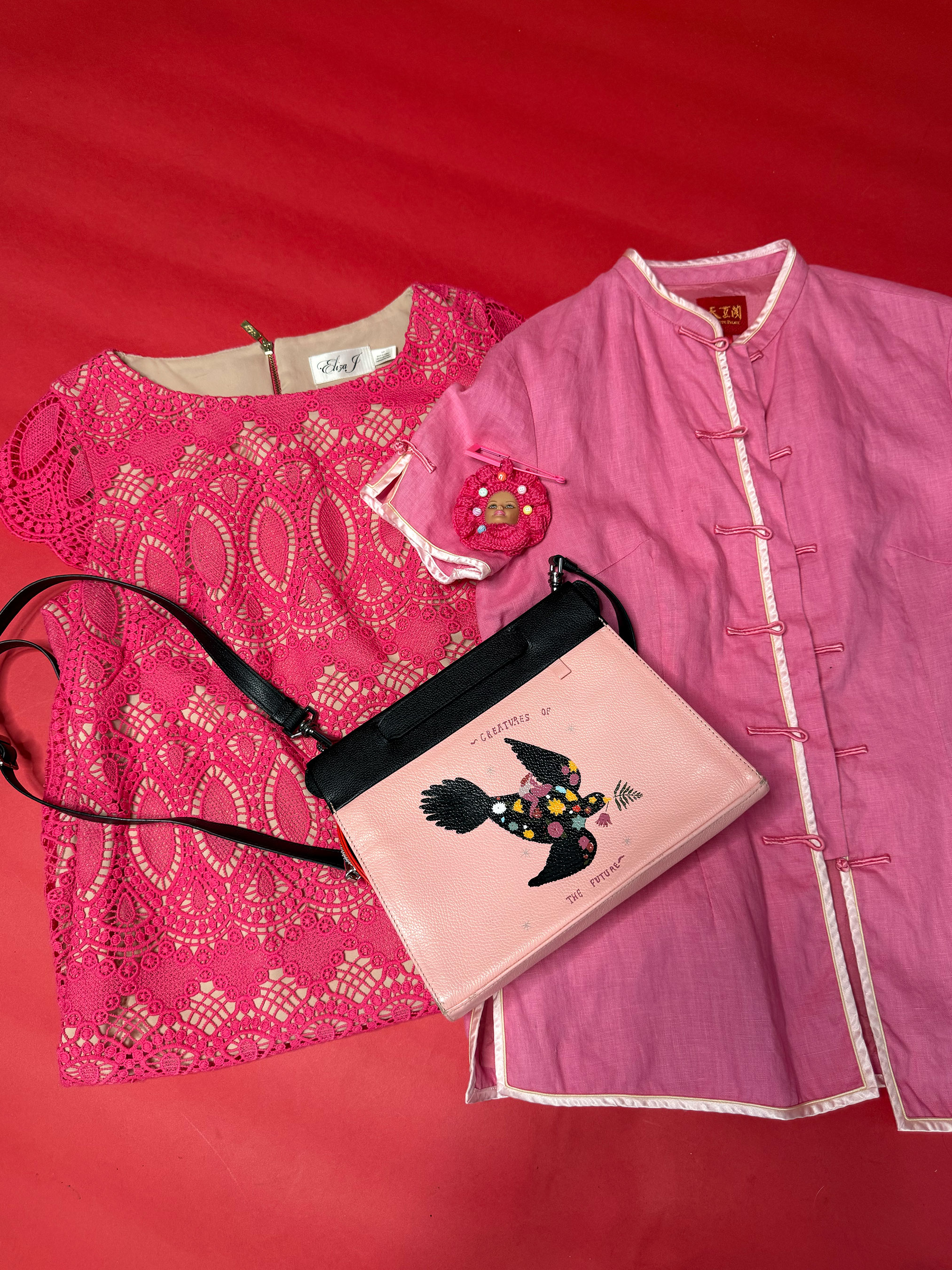 A Barbiecore mini-capsule made from vintage, upcycled, and pre-loved treasures. You get a 90s cheongsam-style Barbie-pink blouse, an upcycled crochet Barbie-head charm, a pre-loved Min & Mon crossbody, and a pink Eliza J lace dress. Everything mixes perfectly for festival, party, or street-style looks. Wear one piece for a pop of pink or all four for full Barbie takeover.