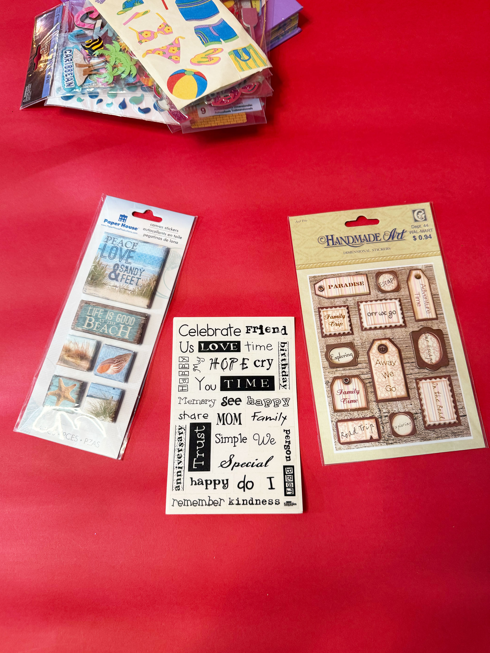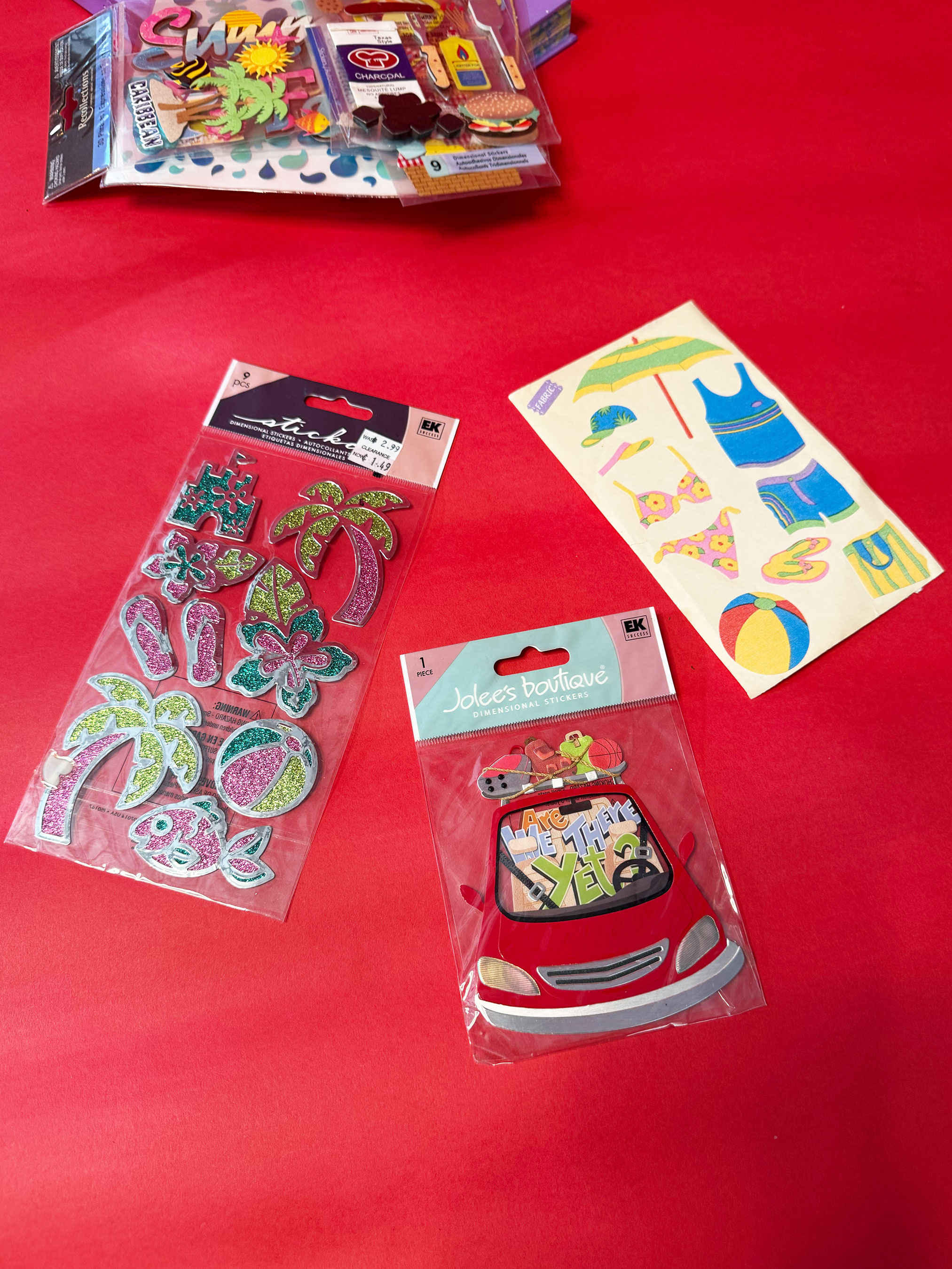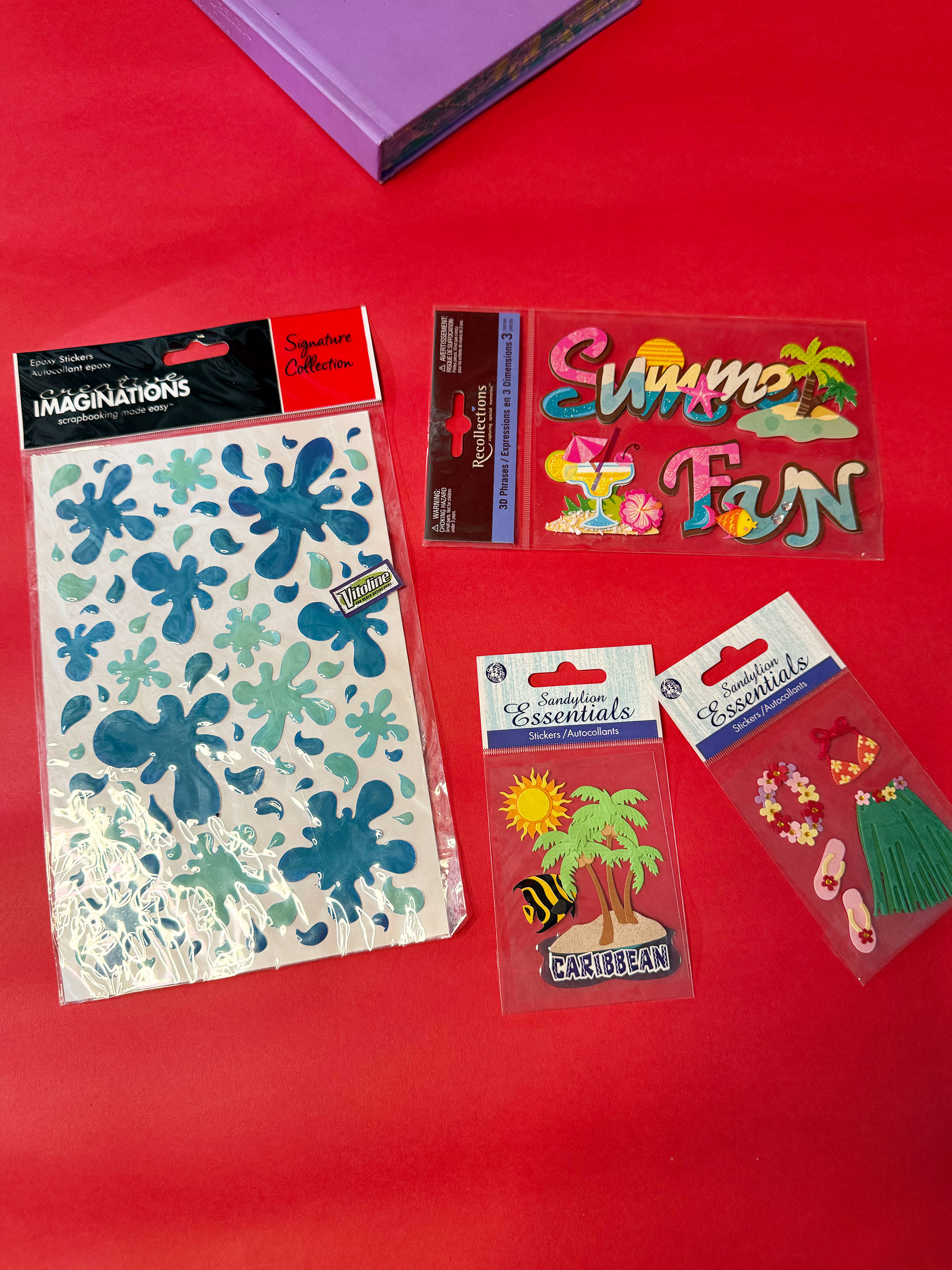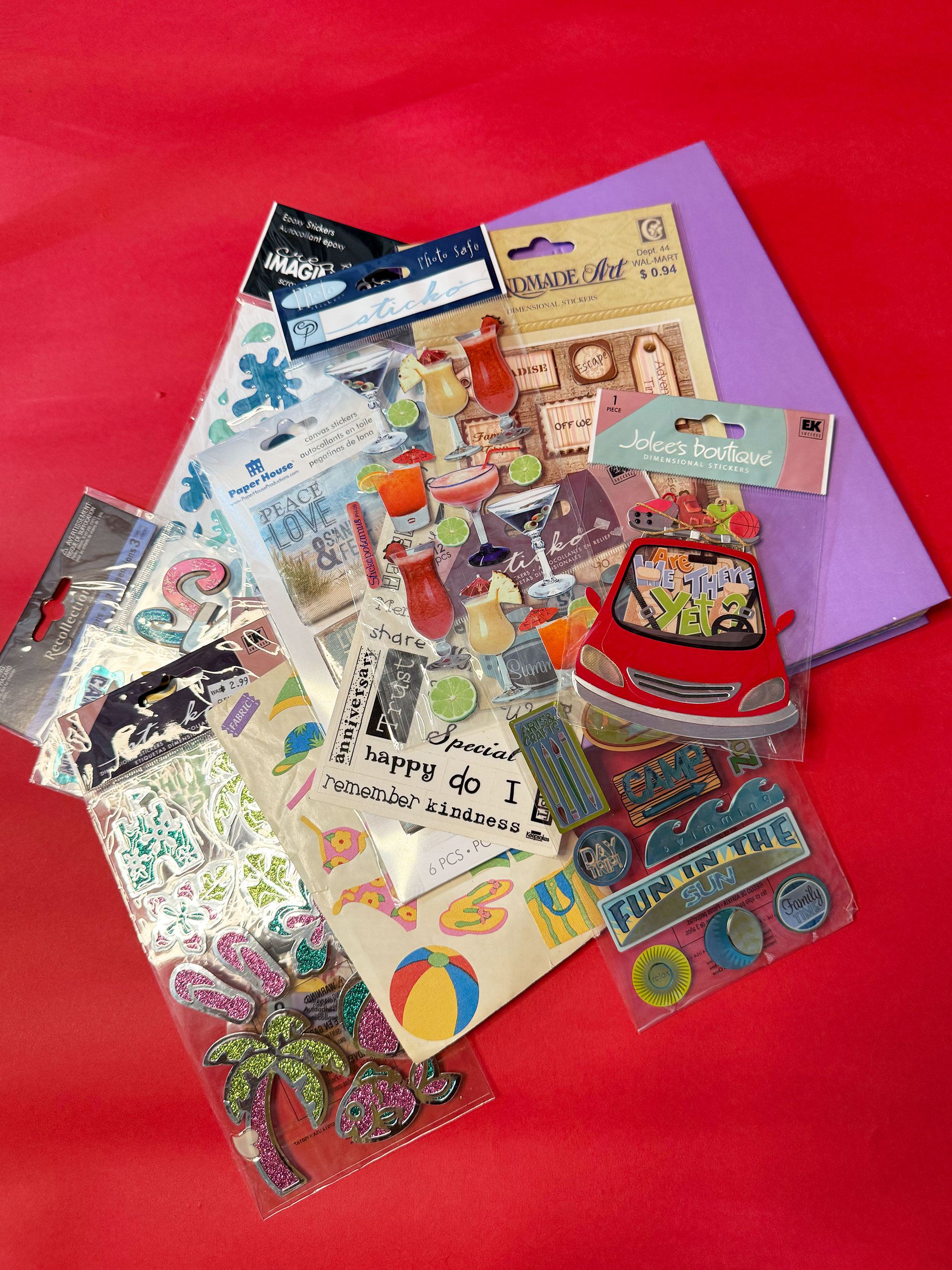 This upcycled bundle includes 15 sealed sticker sheets with beachy, tropical, and travel themes — all unused and perfect for gifting or creative projects. Mix of vintage and modern packs from Jolee’s Boutique, Sandylion, Paper House, Recollections, and more.
