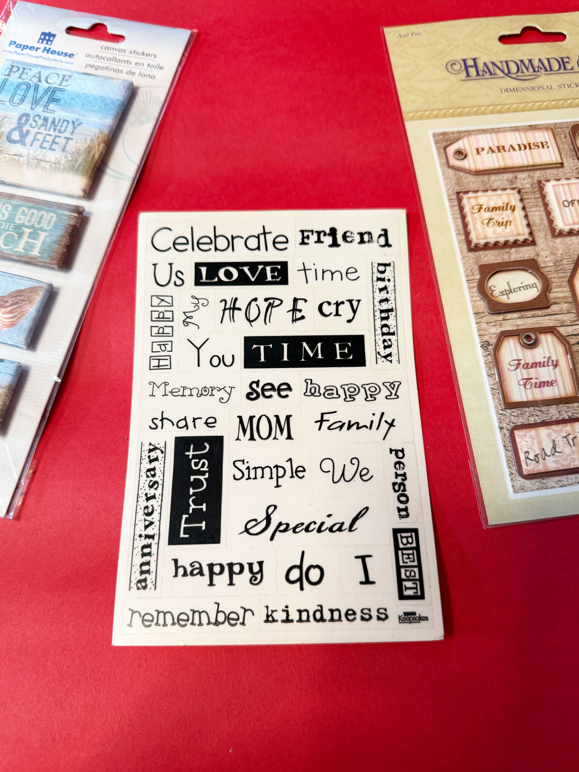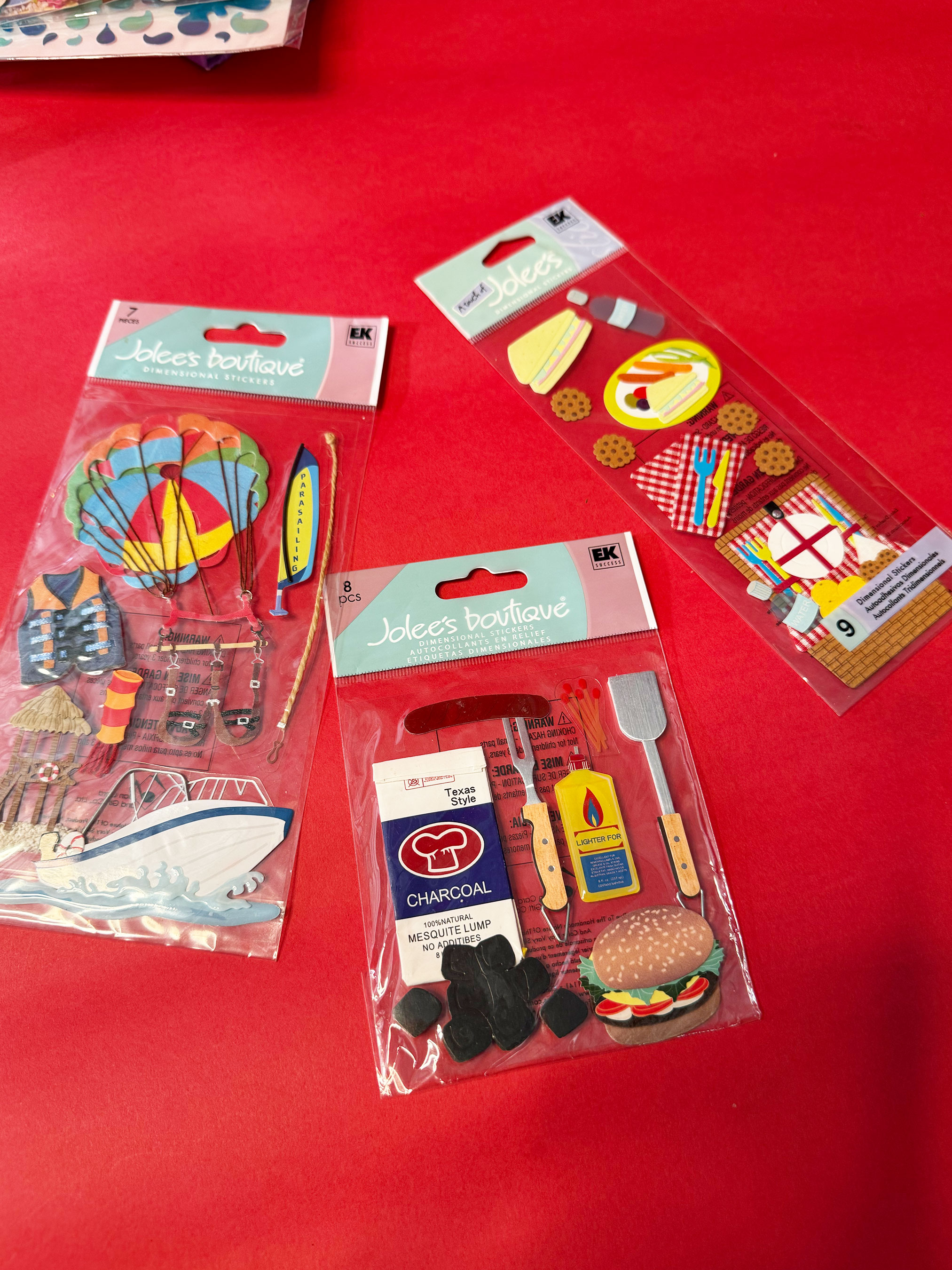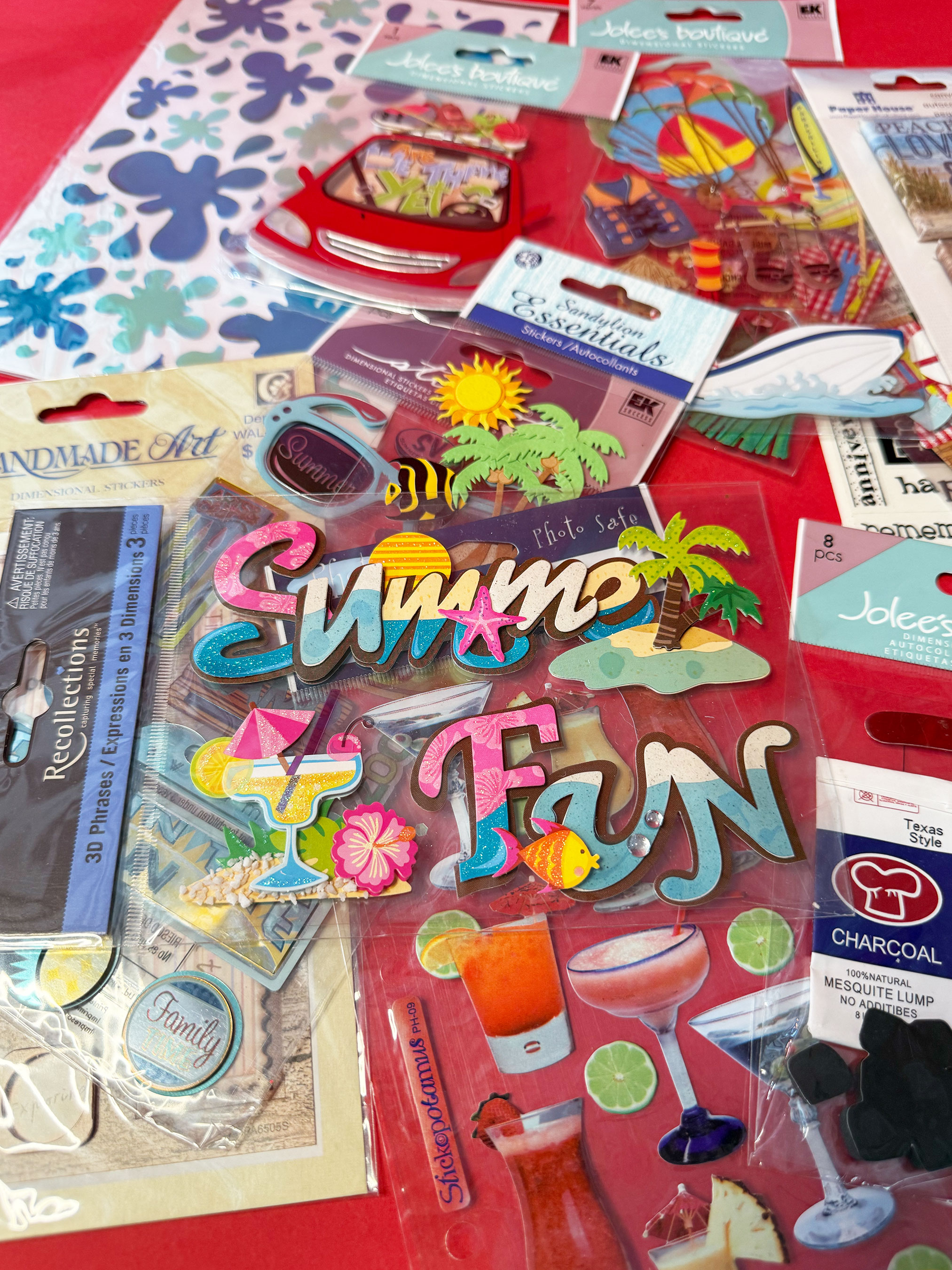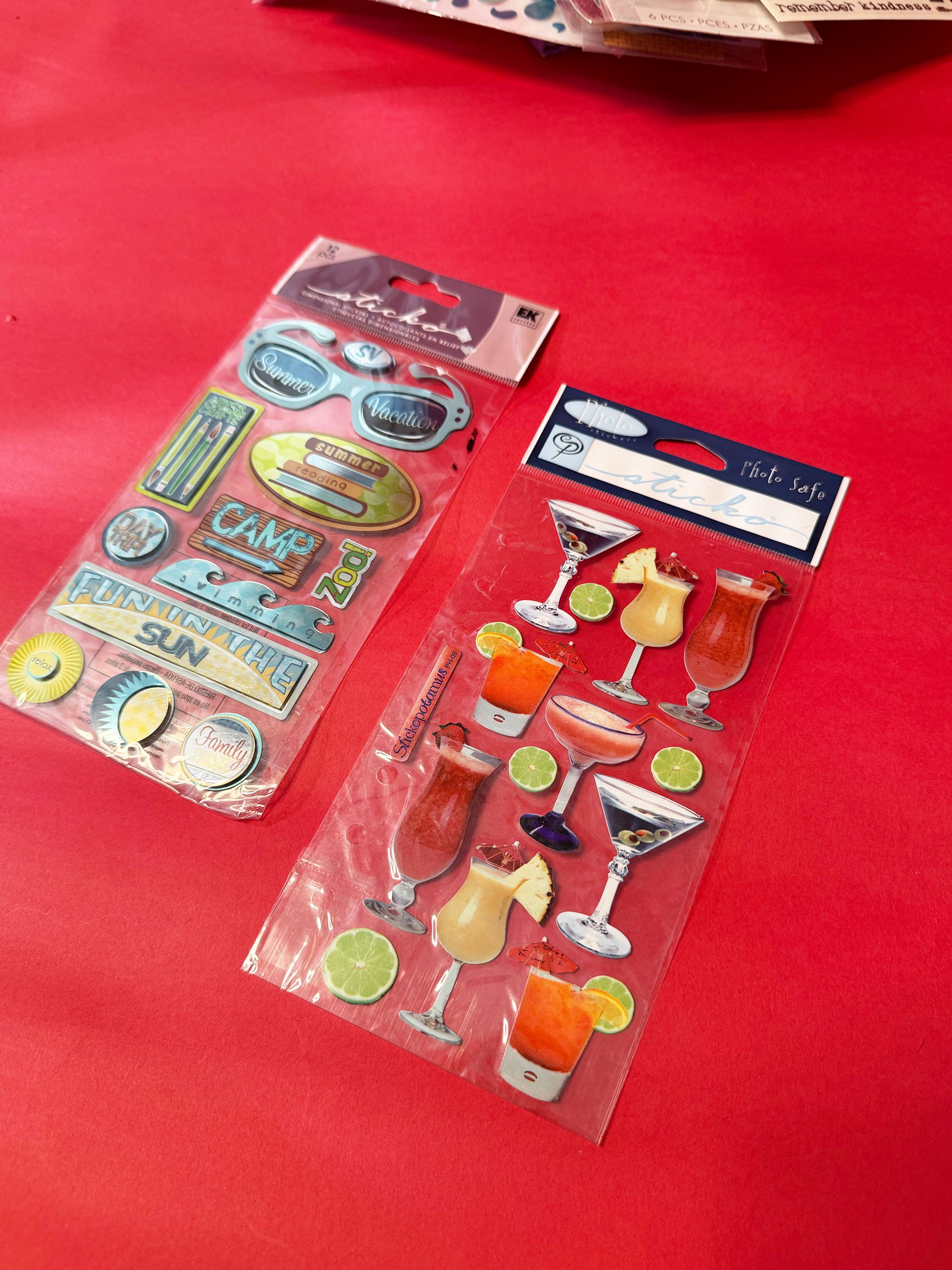 This upcycled bundle includes 15 sealed sticker sheets with beachy, tropical, and travel themes — all unused and perfect for gifting or creative projects. Mix of vintage and modern packs from Jolee’s Boutique, Sandylion, Paper House, Recollections, and more.