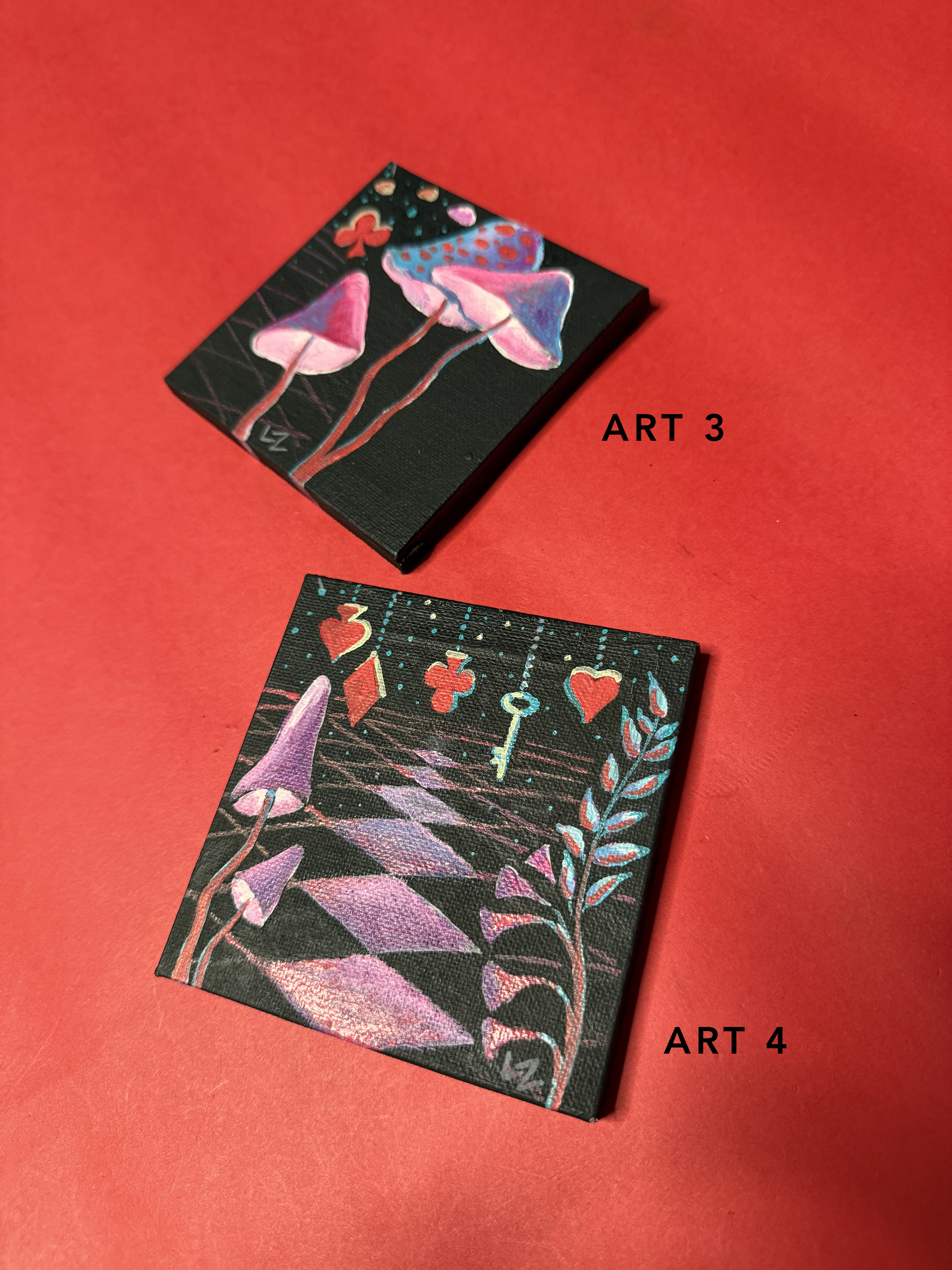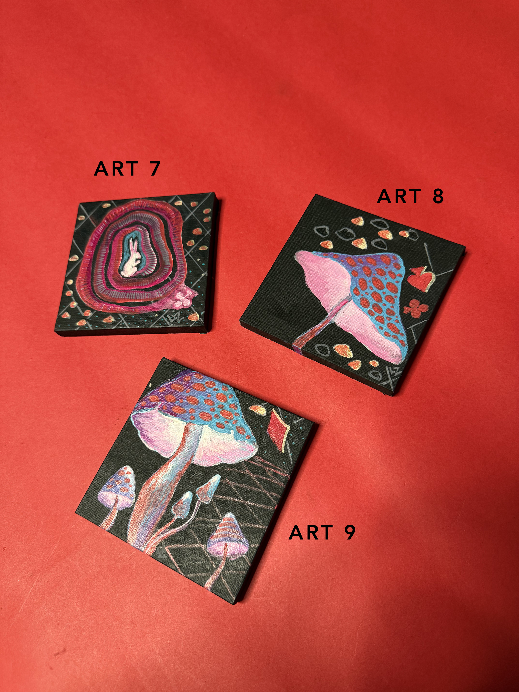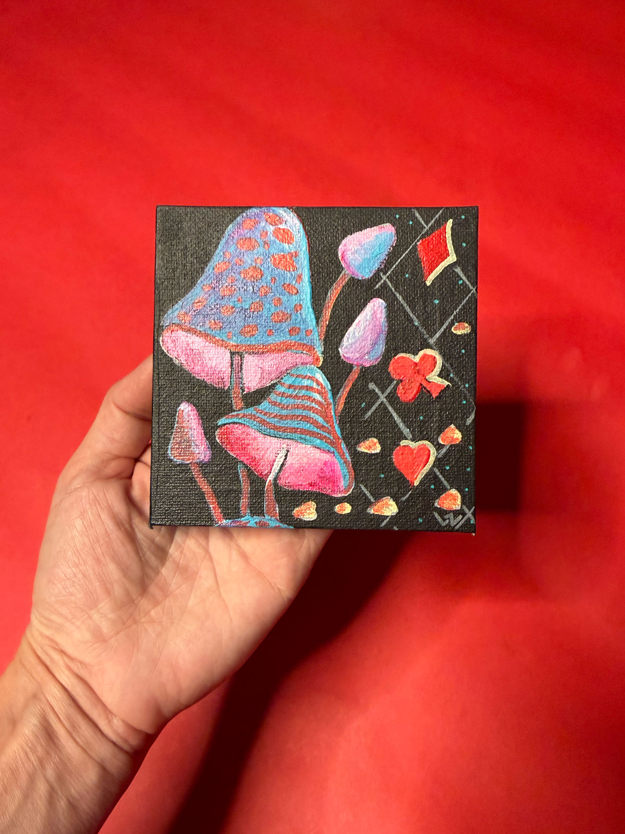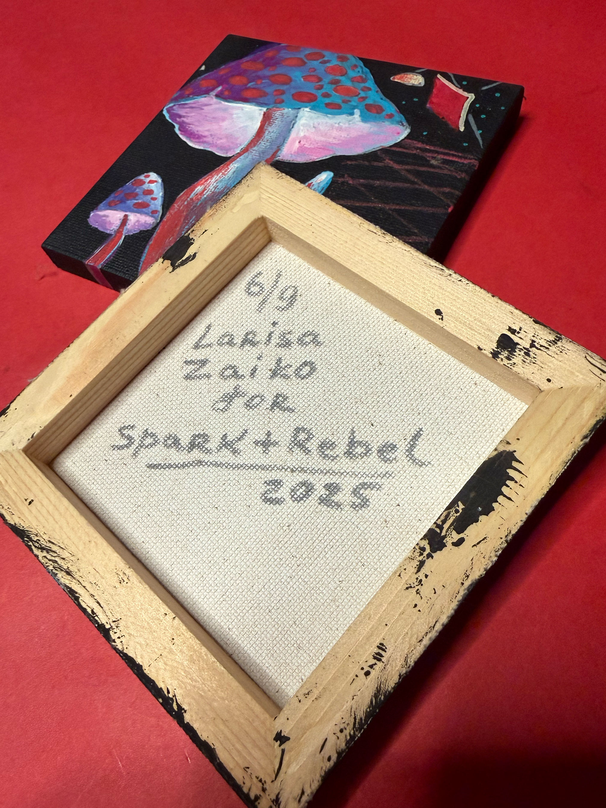 Step into Wonderland, SPARK + REBEL style. This mini art series was hand-painted by studio artist Larisa Zaiko, with each 4x4 inch canvas bursting with dreamy mushrooms, secret keys, and mischievous Wonderland energy. Every piece is signed, numbered, one-of-a-kind, and created in San Diego in 2025. You can choose your favorite from nine originals or build a full little gallery.