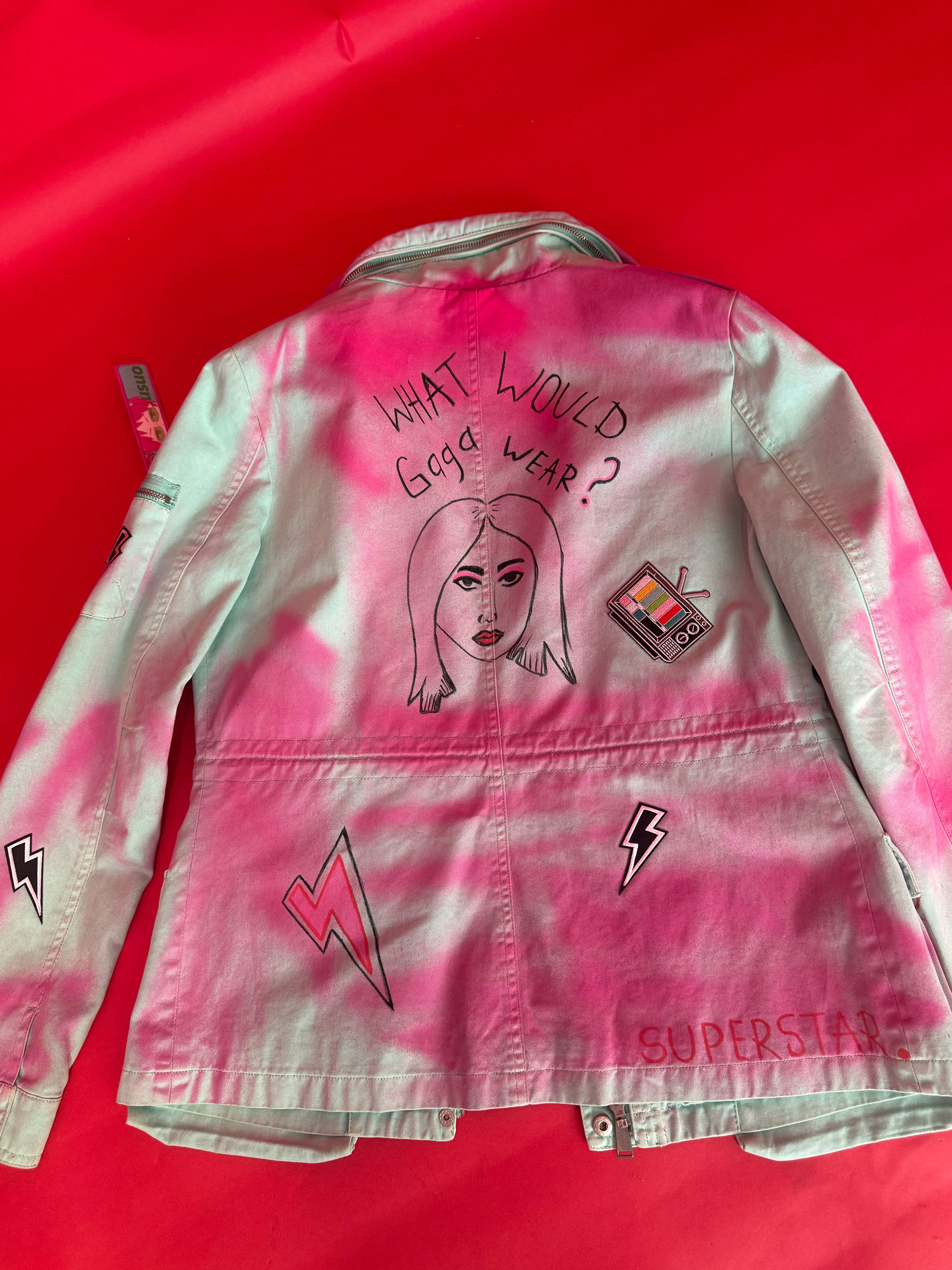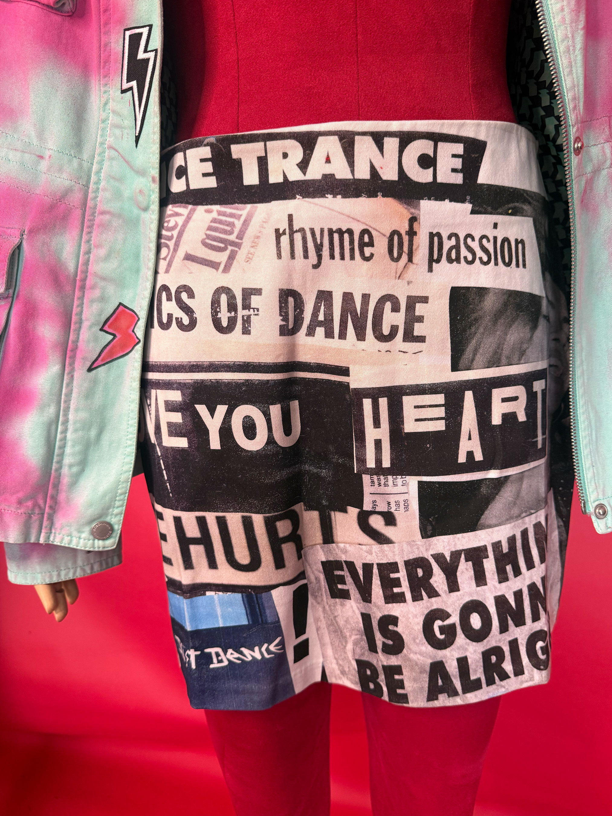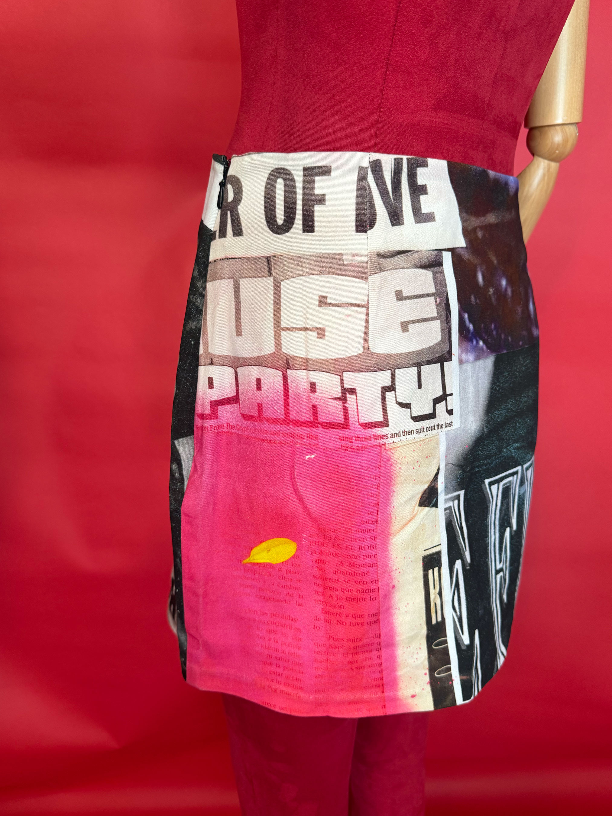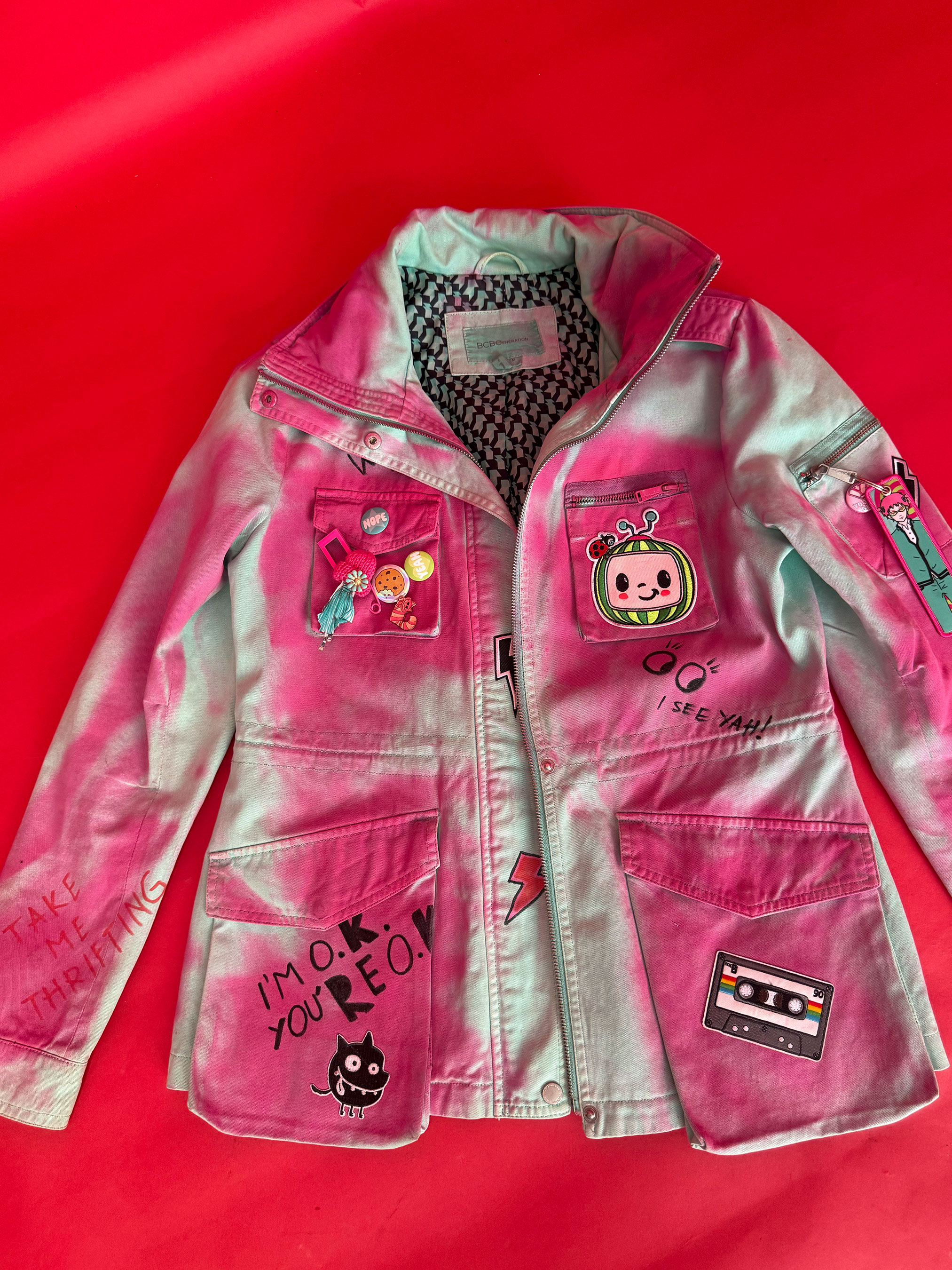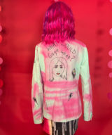This bundle pairs an upcycled, hand-painted vintage BCBG jacket — neon pink, mint, graffiti doodles, and Gaga-level attitude — with a new-with-tags Desigual newspaper-print mini skirt. It’s a full story of creativity, rebellion, and bold self-expression. Jacket is a reimagined Size M (27” length, 36” bust), skirt is Size M (16” length, 28” waist). A vibrant, one-of-a-kind combo ready for main-character moments.