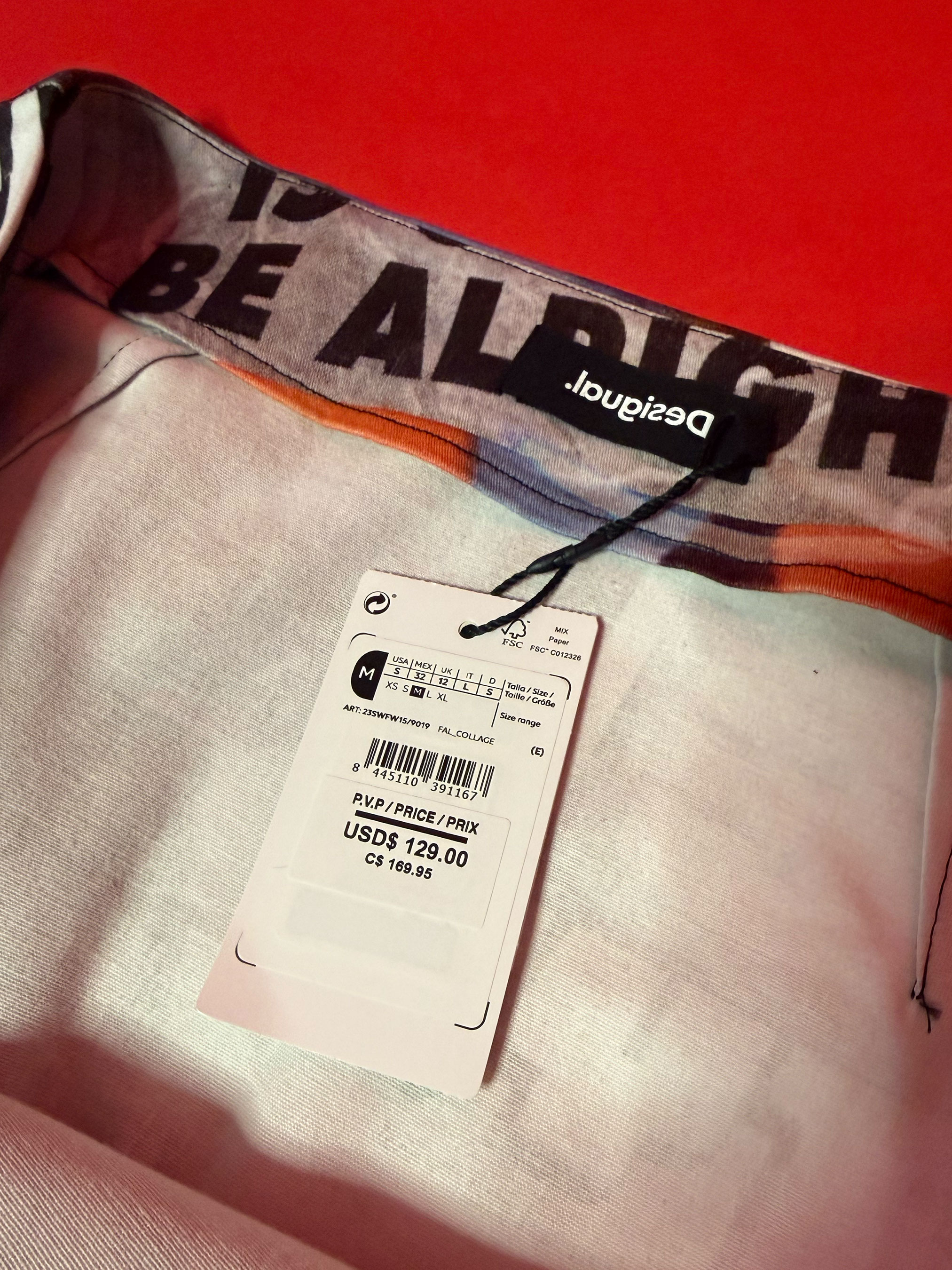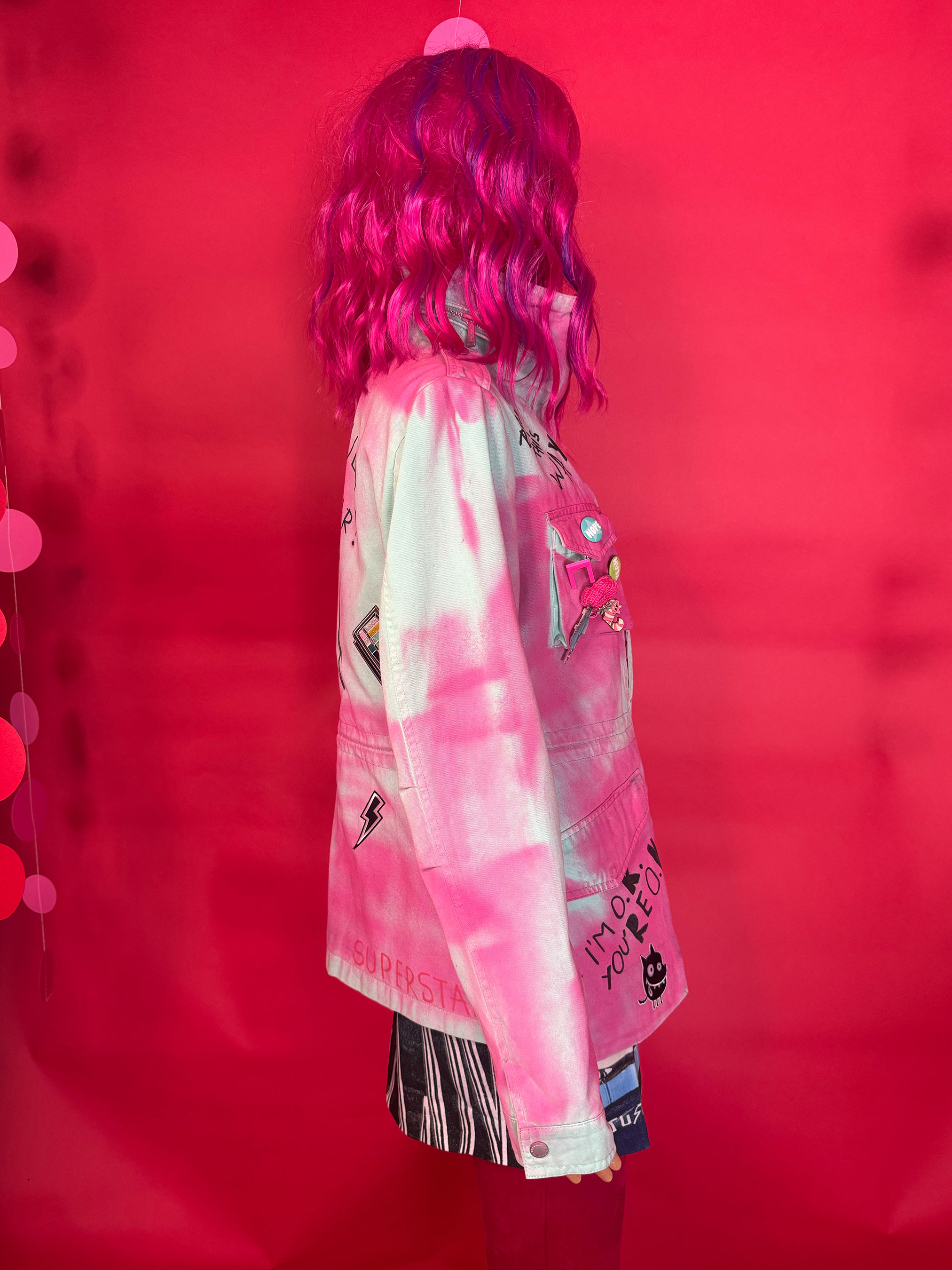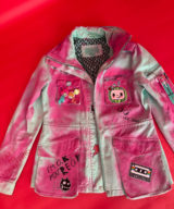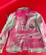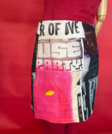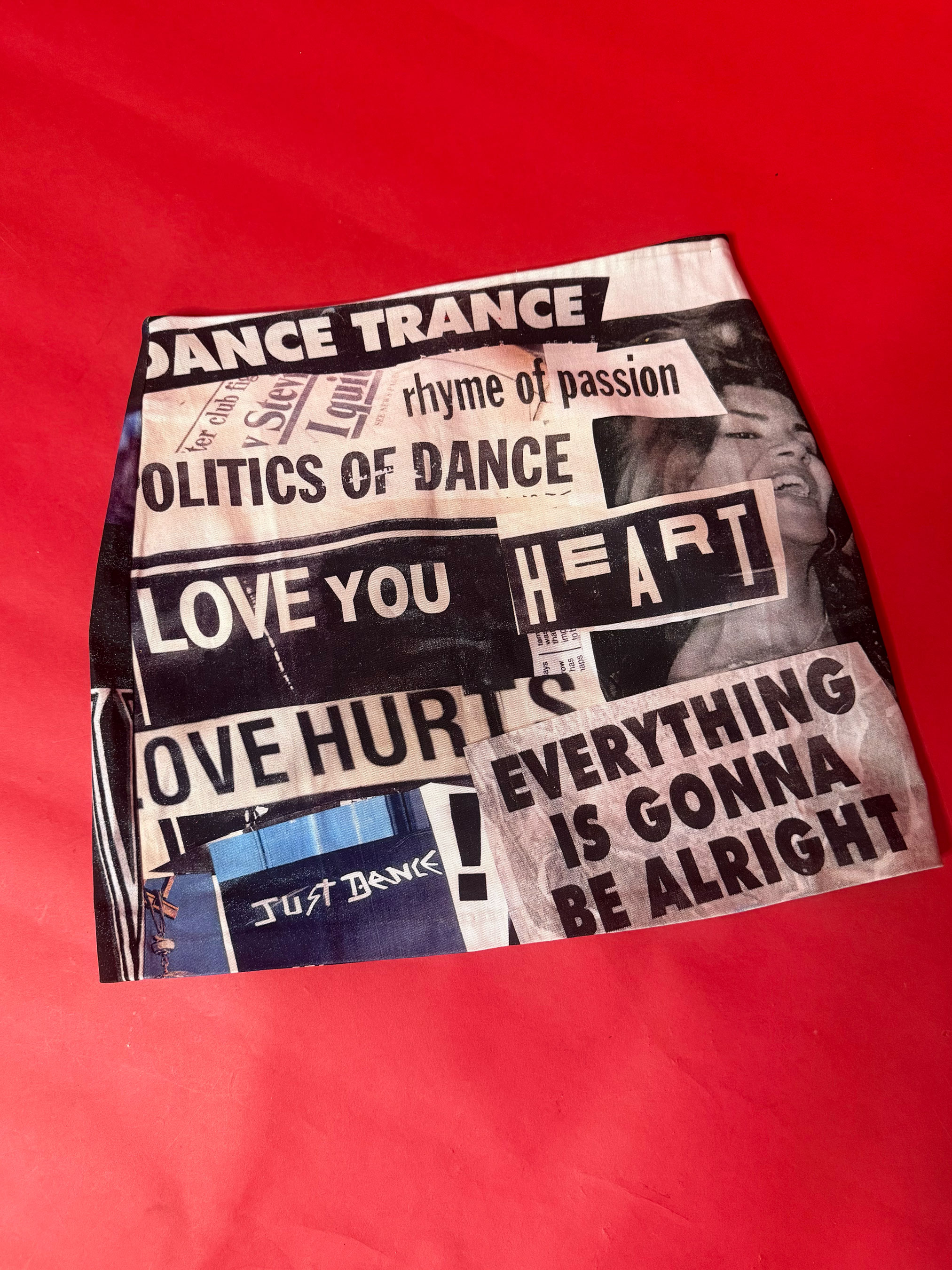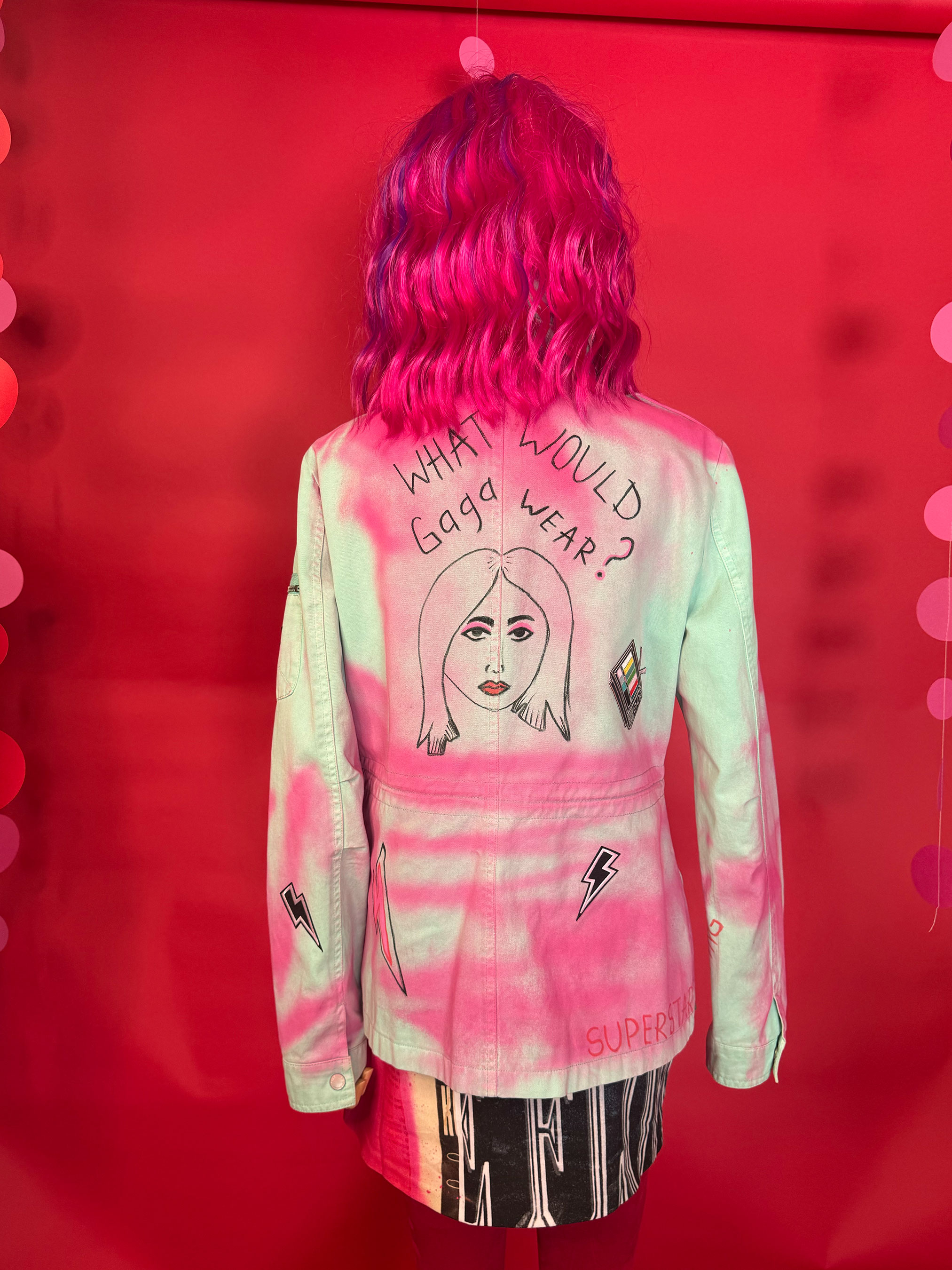 This bundle pairs an upcycled, hand-painted vintage BCBG jacket — neon pink, mint, graffiti doodles, and Gaga-level attitude — with a new-with-tags Desigual newspaper-print mini skirt. It’s a full story of creativity, rebellion, and bold self-expression. Jacket is a reimagined Size M (27” length, 36” bust), skirt is Size M (16” length, 28” waist). A vibrant, one-of-a-kind combo ready for main-character moments.