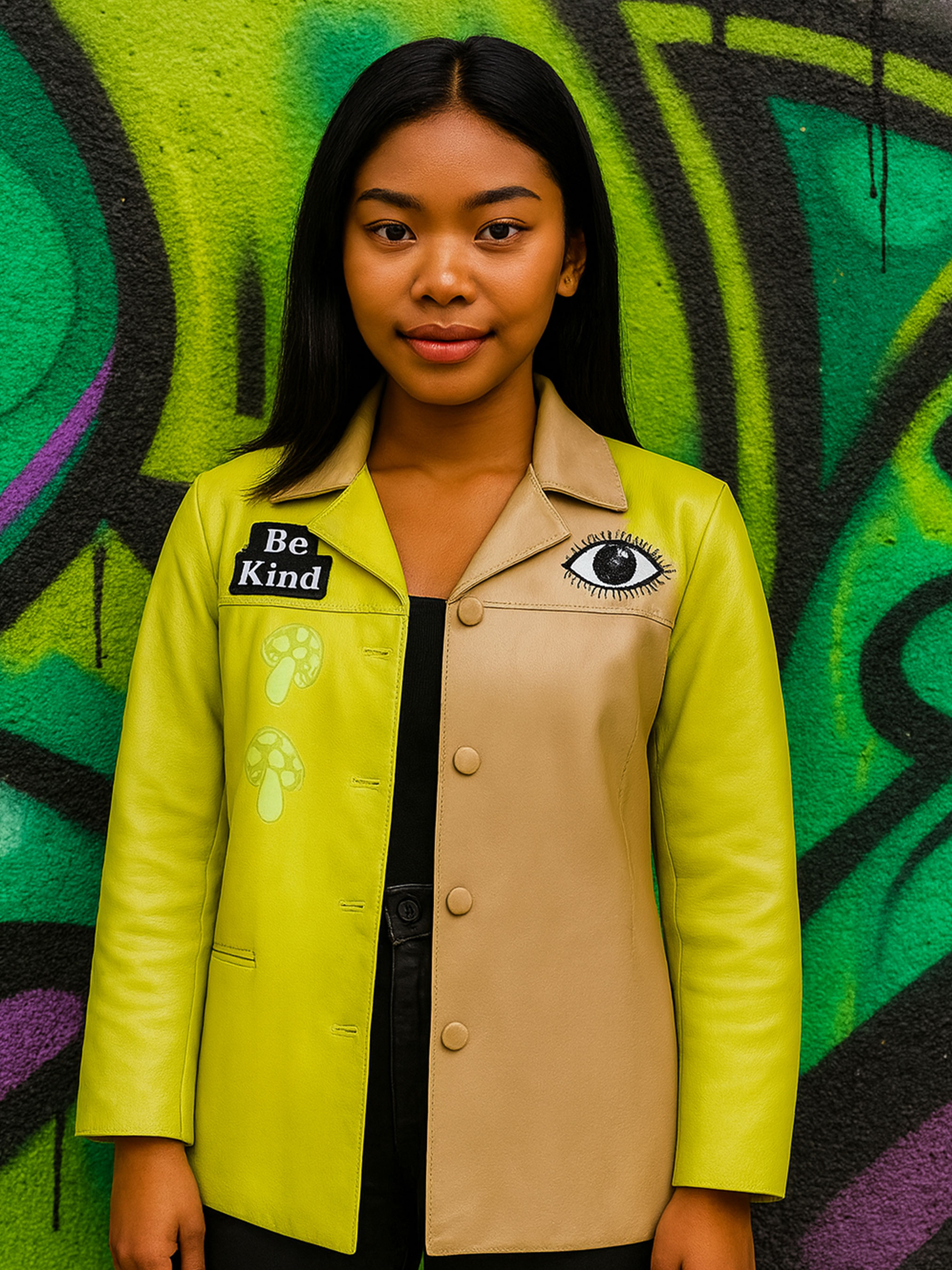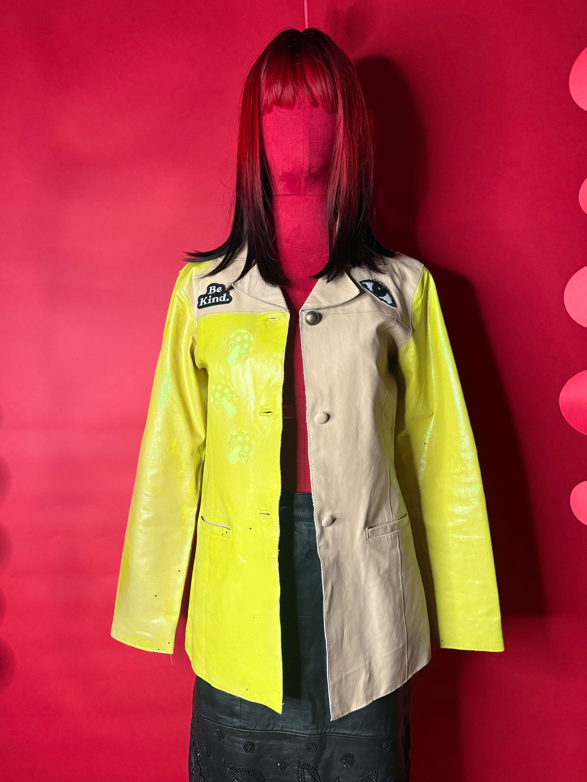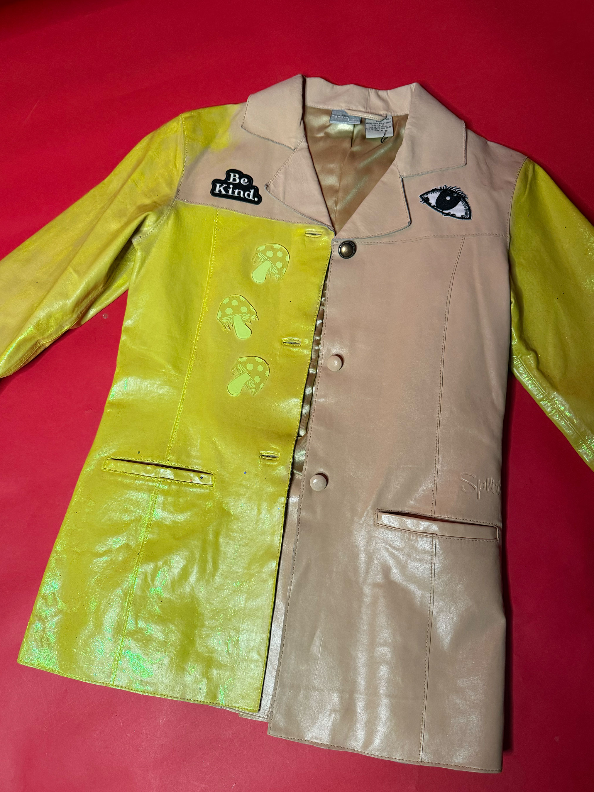 Perfect for anyone who loves bold color, playful energy, and sustainable street style. Upcycled in-house at SPARK + REBEL, this vintage leather jacket now carries hand-painted mushrooms, an all-seeing eye, and a “Be Kind” patch. It’s 100 percent leather with a single-breasted closure and light vintage wear, with all artwork freshly added and sealed. Sized like a small, it measures 36 inches in the bust, 29 in length, and 24 in the sleeves.