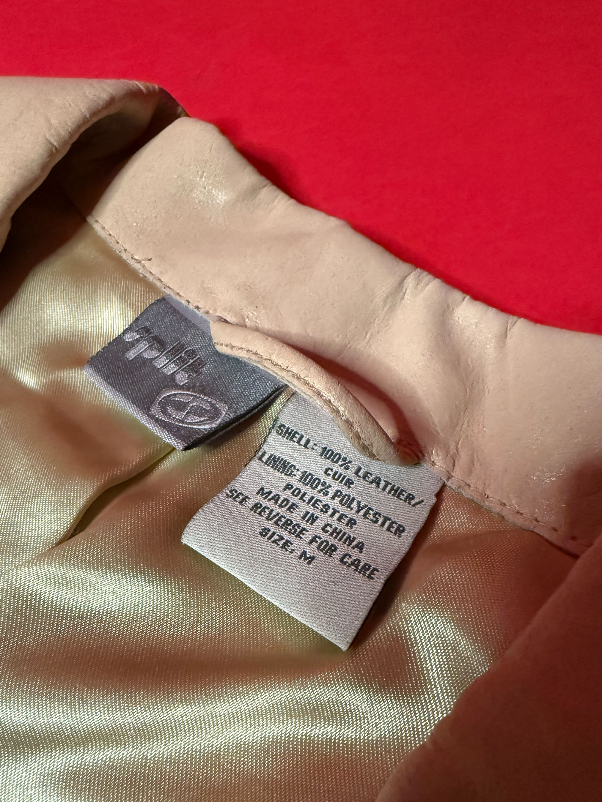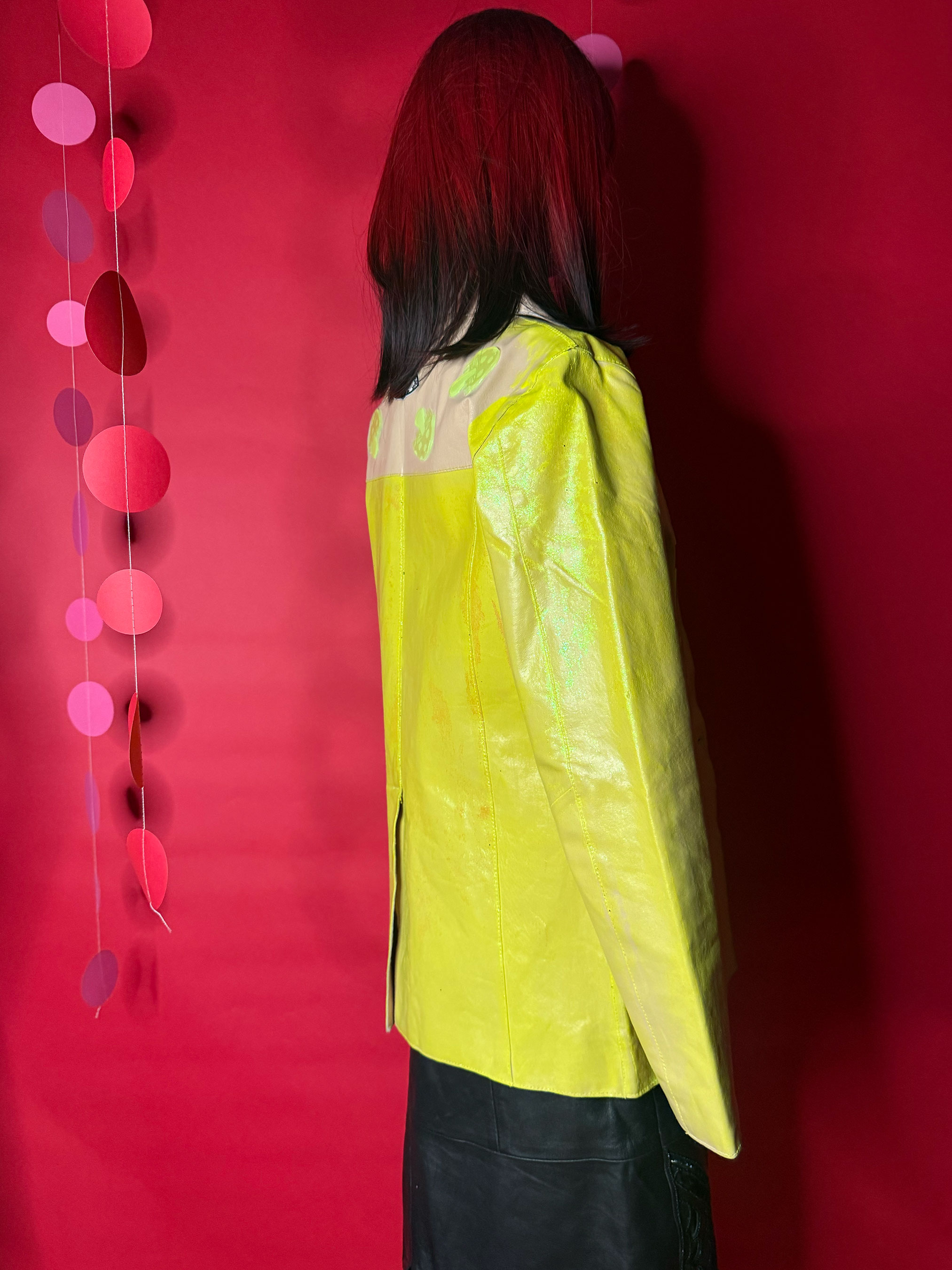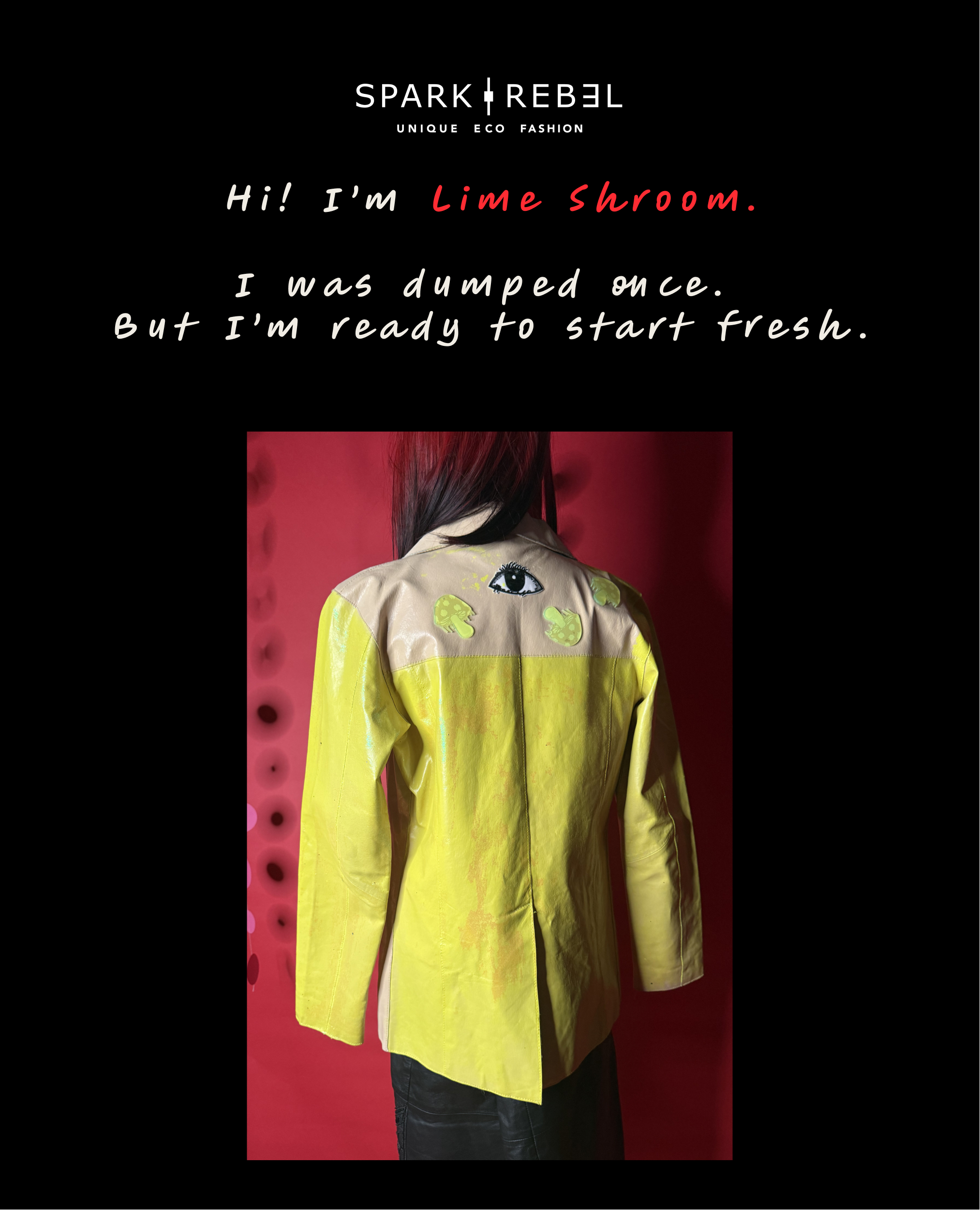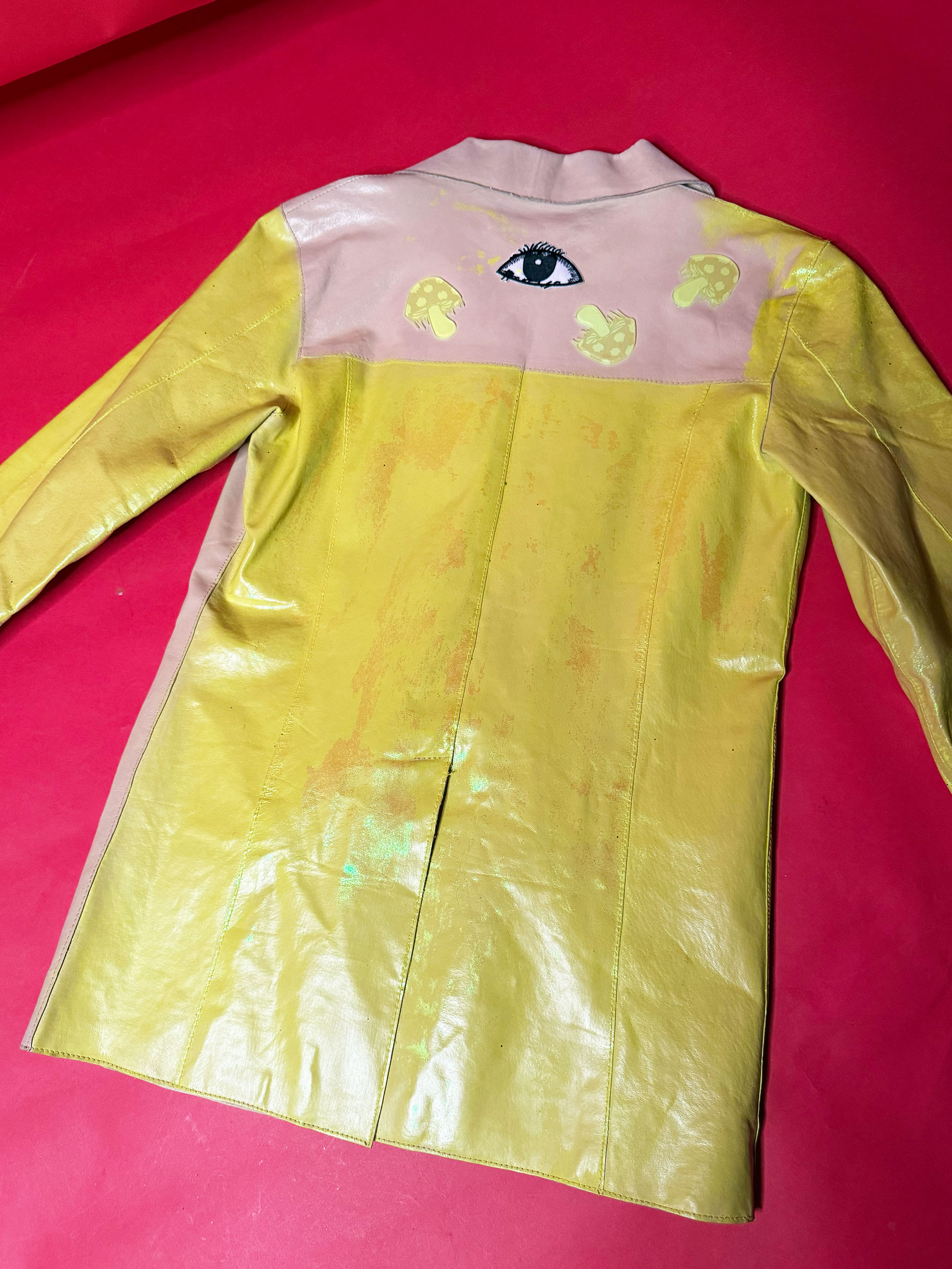 Perfect for anyone who loves bold color, playful energy, and sustainable street style. Upcycled in-house at SPARK + REBEL, this vintage leather jacket now carries hand-painted mushrooms, an all-seeing eye, and a “Be Kind” patch. It’s 100 percent leather with a single-breasted closure and light vintage wear, with all artwork freshly added and sealed. Sized like a small, it measures 36 inches in the bust, 29 in length, and 24 in the sleeves.