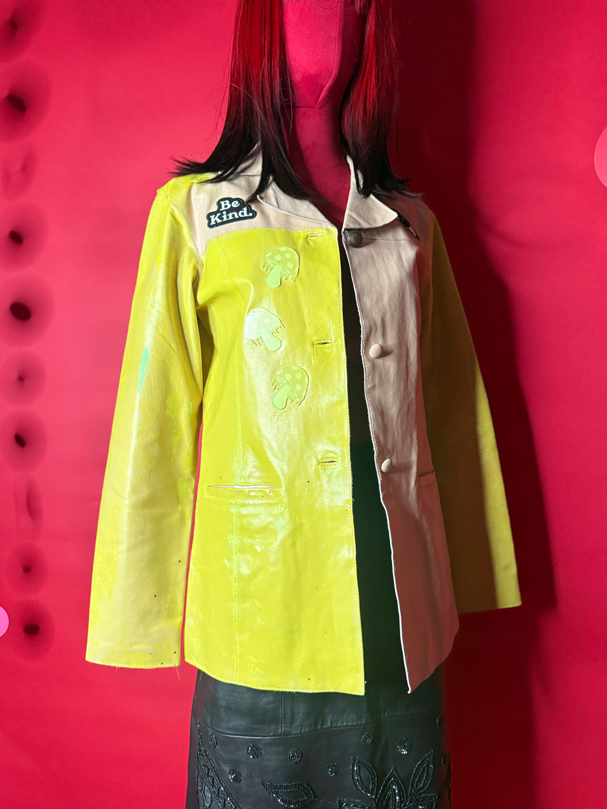 Hand-painted in neon yellow and cream, finished with custom mushroom graphics, a bold embroidered eye, and a “Be Kind” patch.