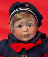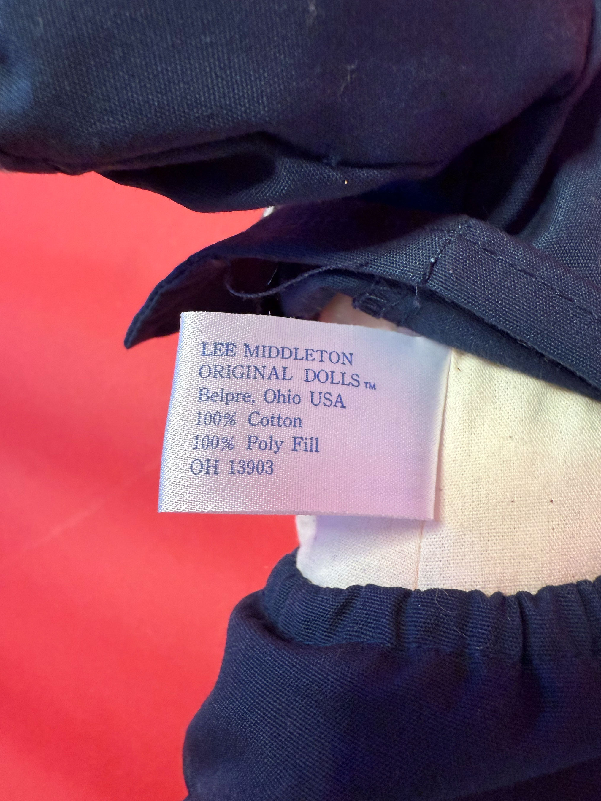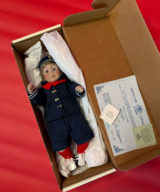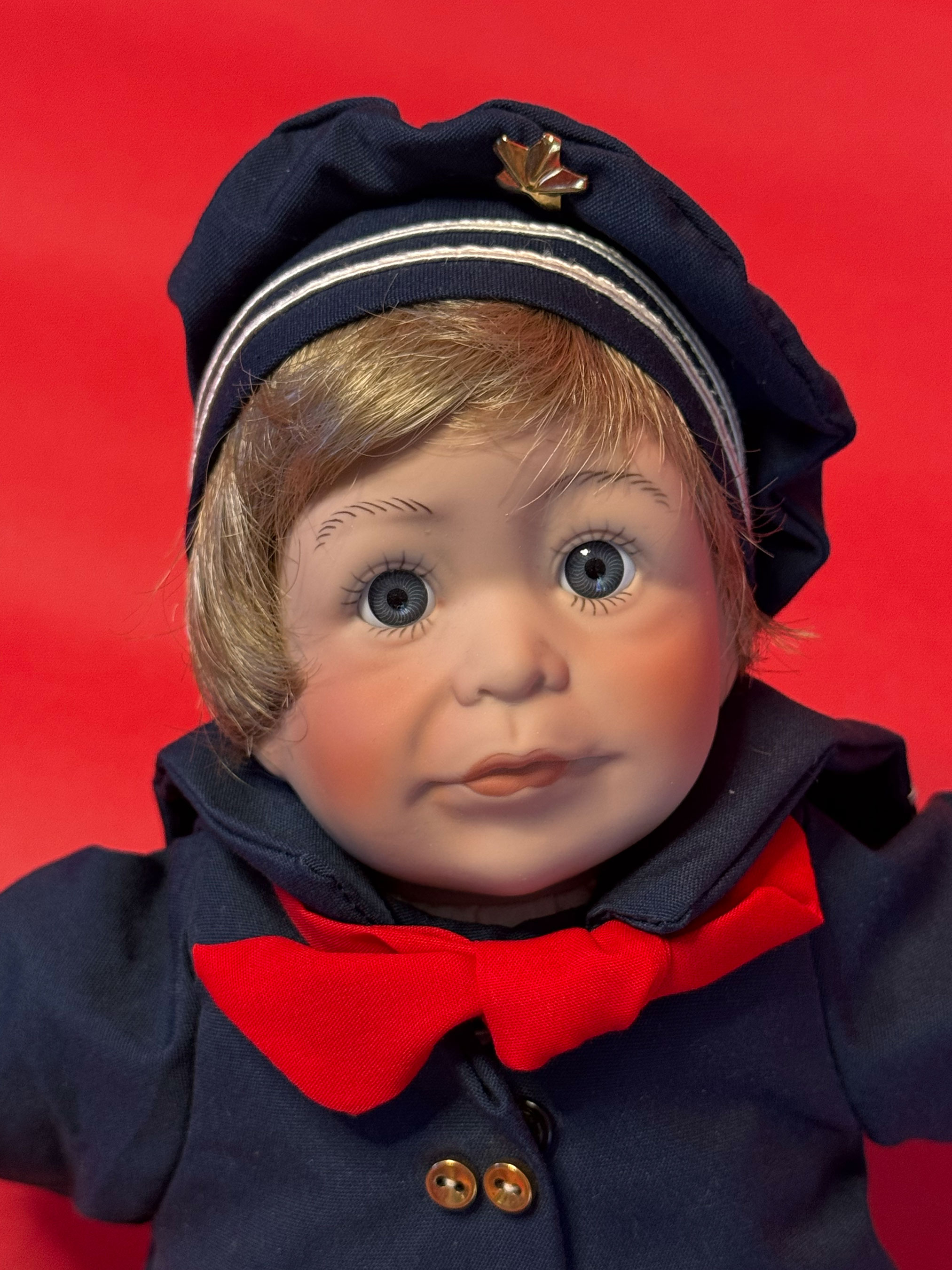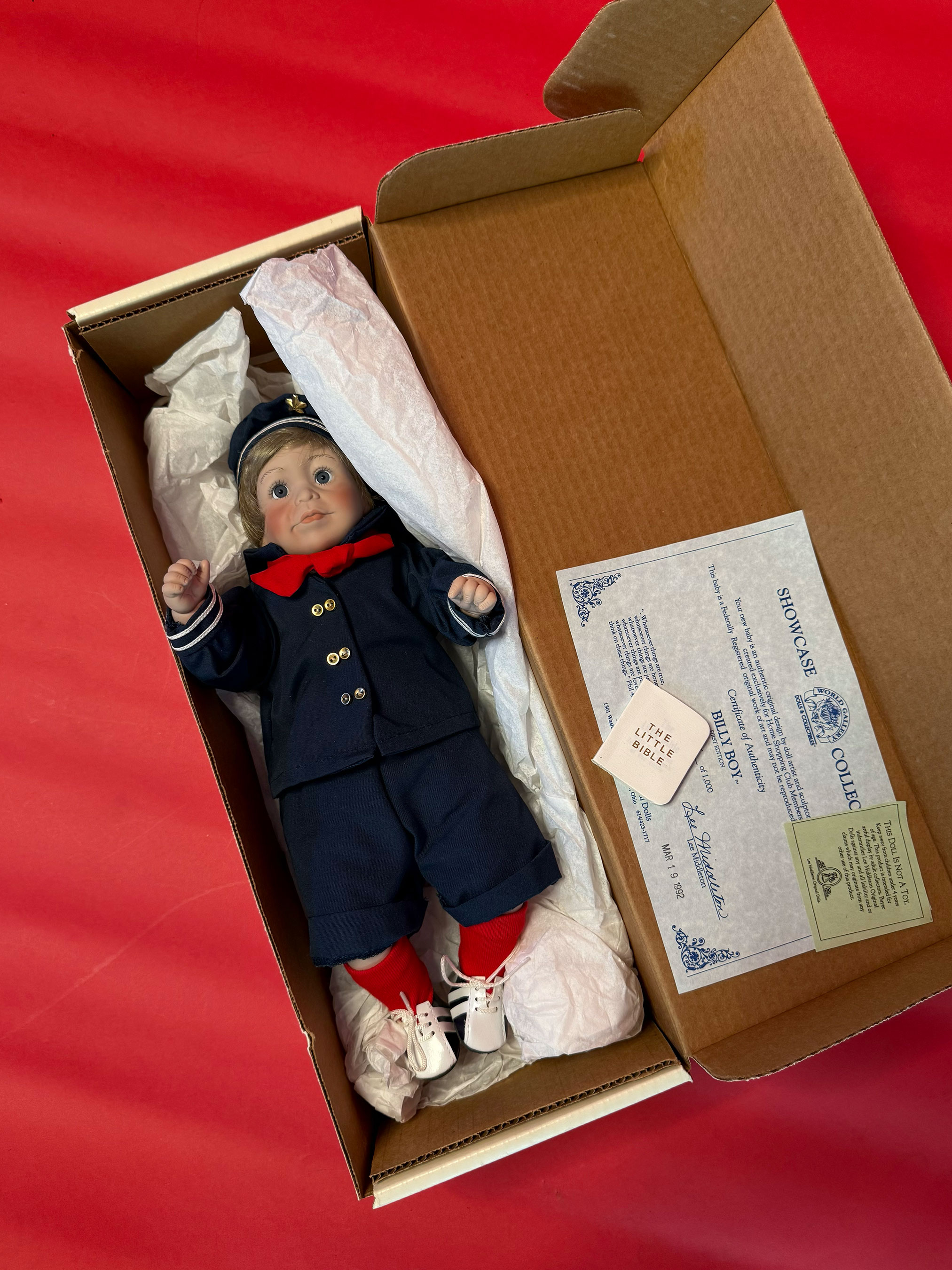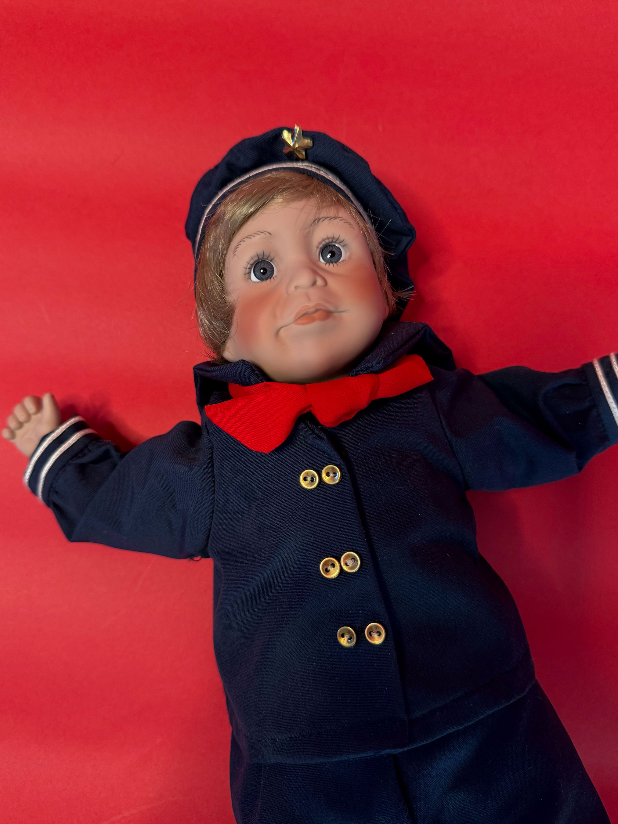 Meet Billy Boy. A charming collectible from the beloved Lee Middleton Showcase Collection, this 1992 first edition doll comes dressed in a navy sailor outfit with a bright red bow tie and gold buttons.