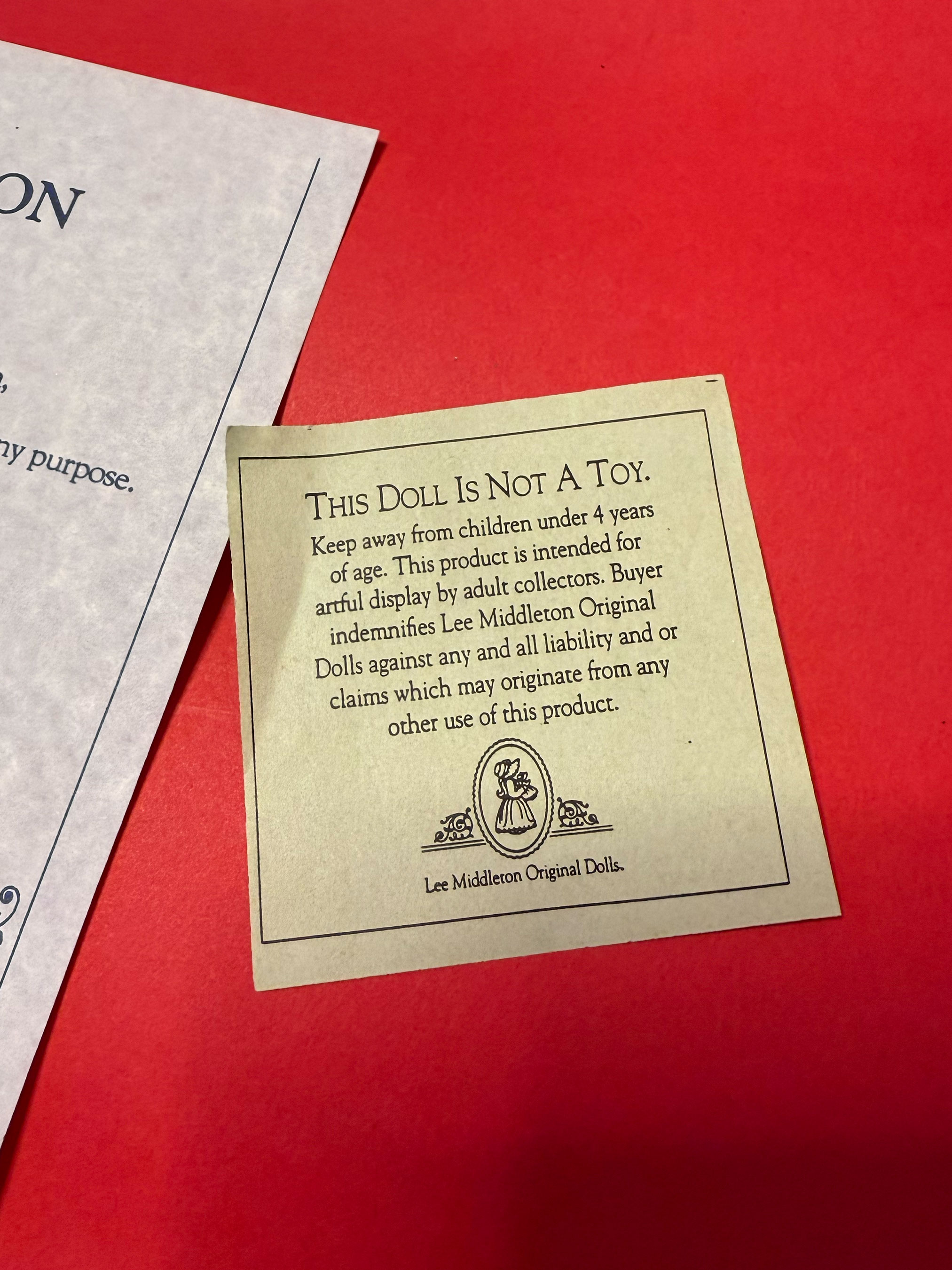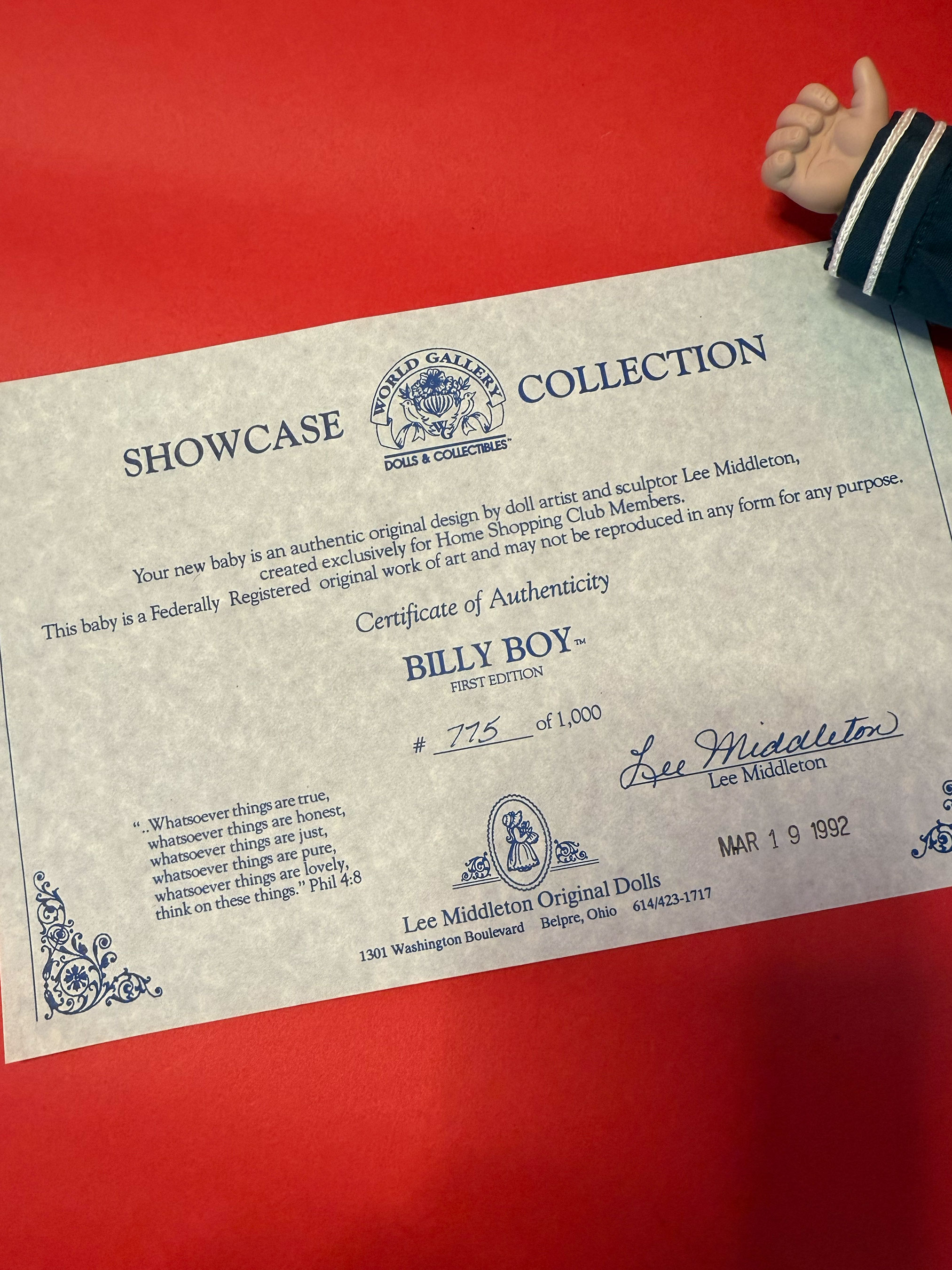 His sweet expression, porcelain details, and full Certificate of Authenticity make this 1992 Lee Middleton “Billy Boy” a true treasure for vintage doll lovers. A Limited First Edition (No. 775 of 1000), he measures 14 inches, comes in his navy sailor outfit with matching hat, and includes all original tags, paperwork, and box materials — gently displayed, never played with.