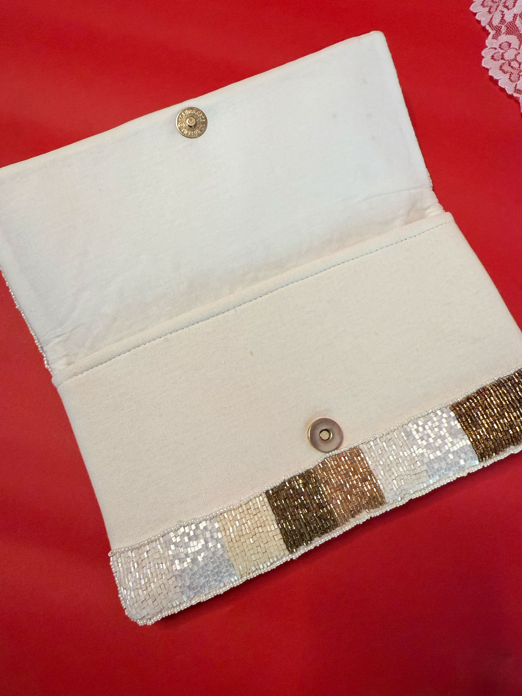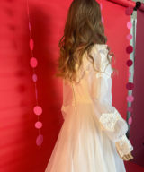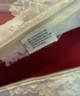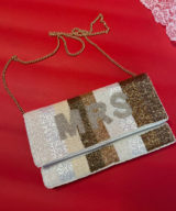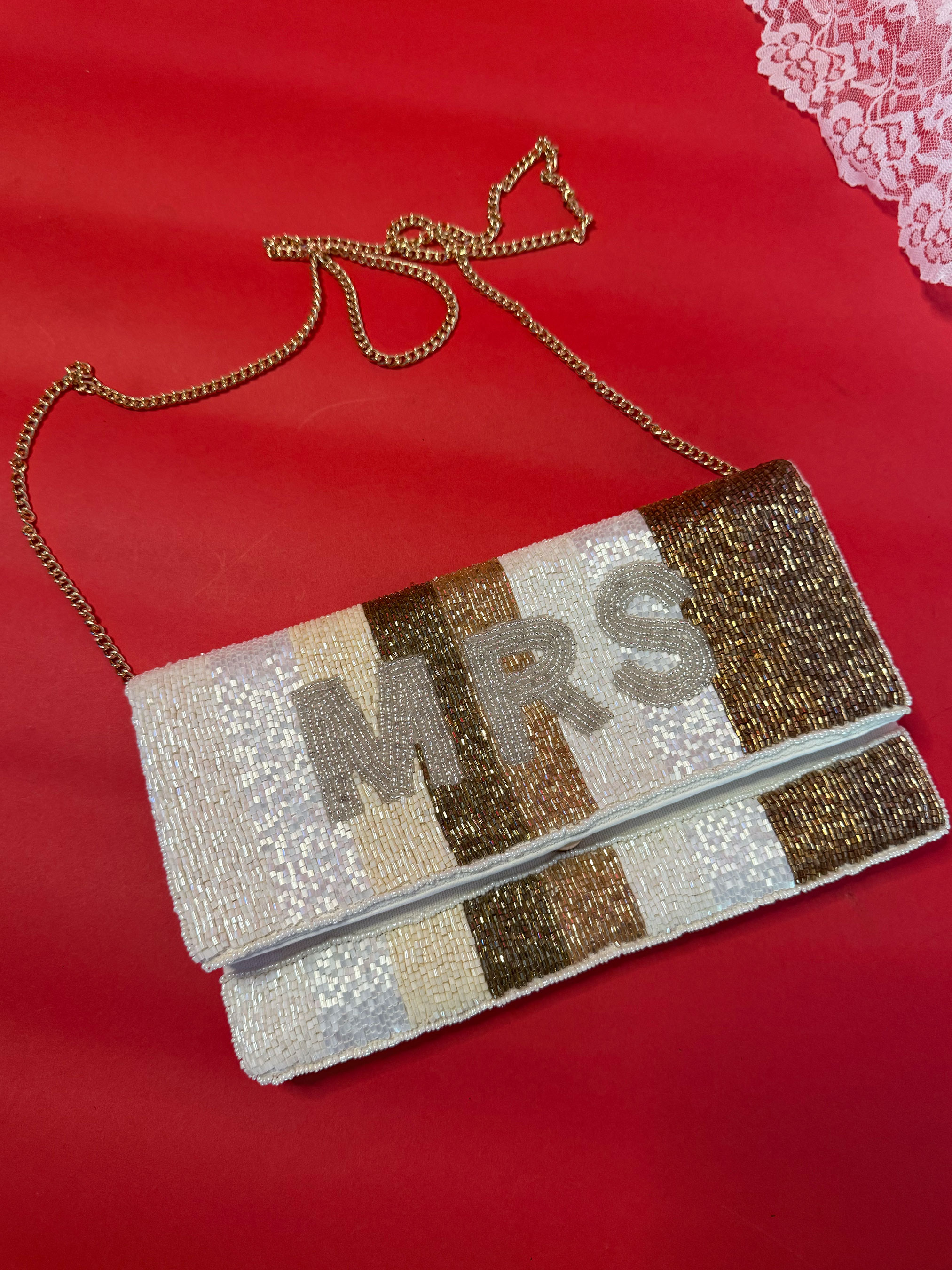 Paired with a sparkly gold “Mrs” clutch, this look is made for vow renewals, themed weddings, or stealing the spotlight. The Victorian-inspired gown brings sheer lace, pearl beading, and a sweeping train for full main-character energy. Dress fits like a US Small — Bust 33.5”, Waist 27”, Length ~83”, Sleeves 25”. The beaded “Mrs” clutch (10" x 6") adds the perfect touch of glam.