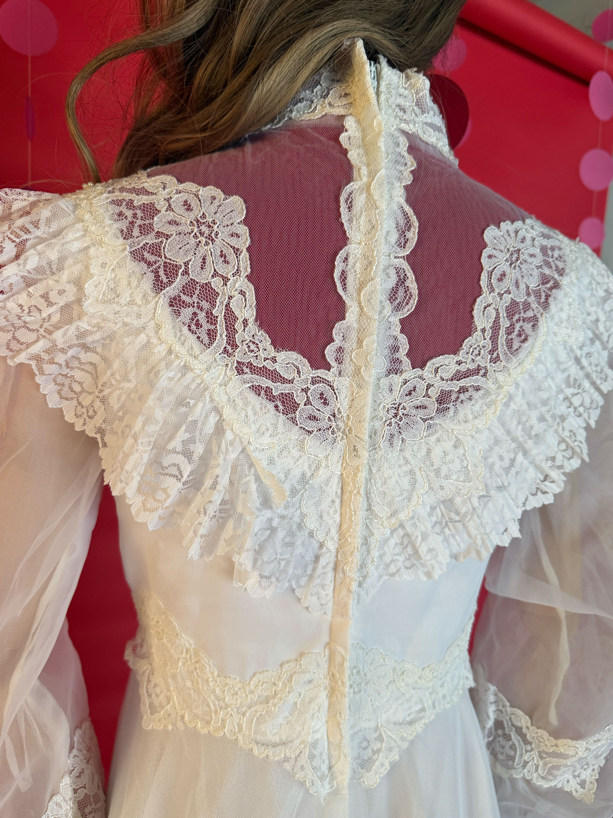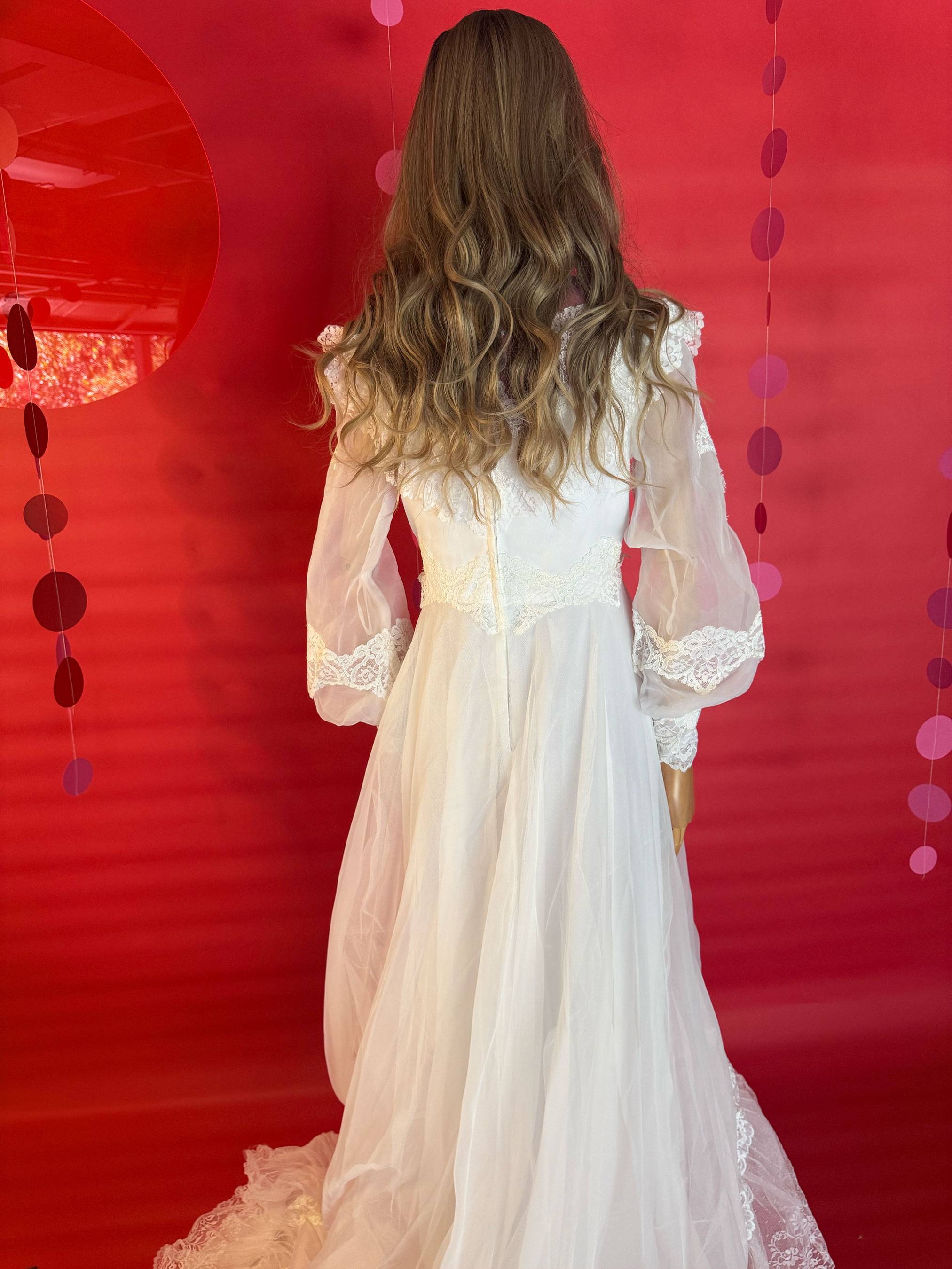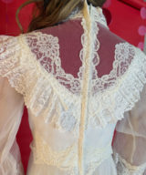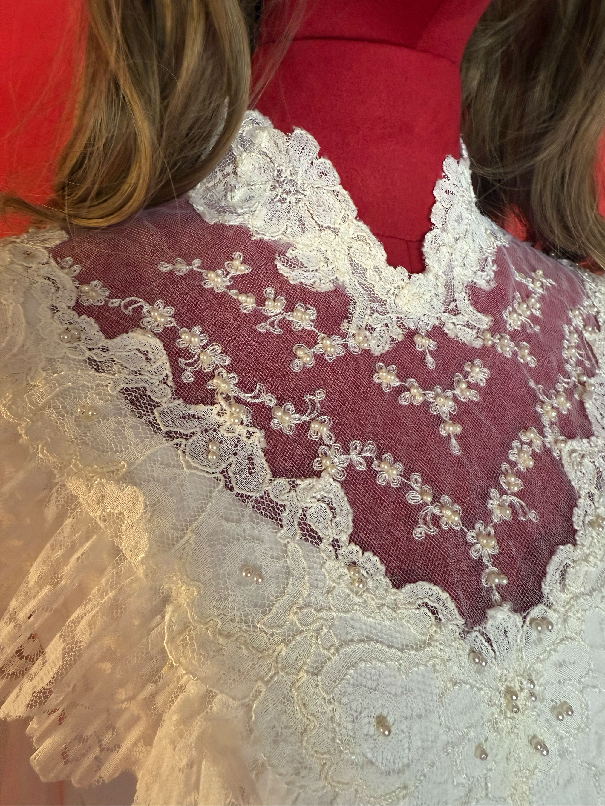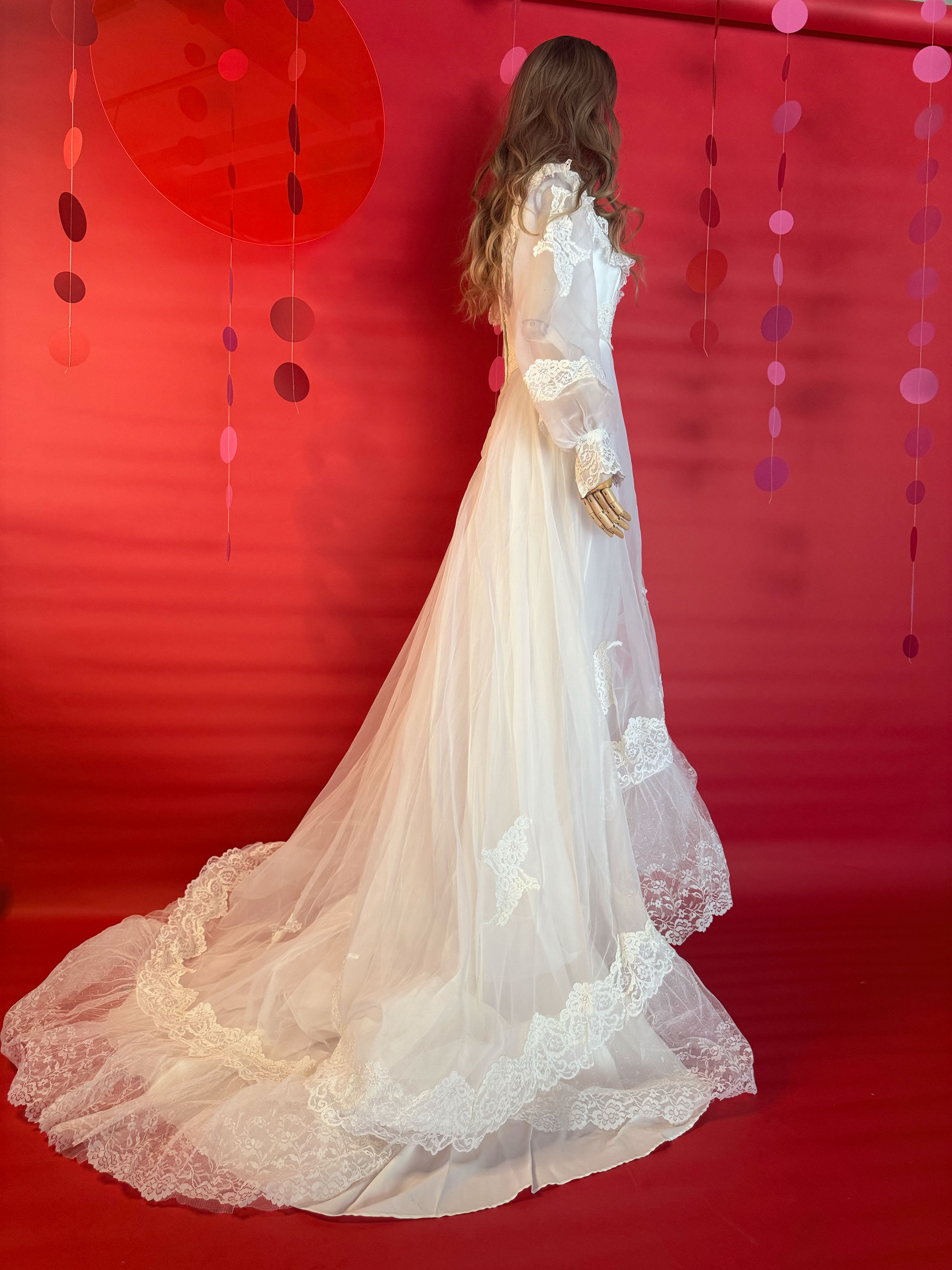 Say yes to a dreamy throwback. This 1970s lace gown brings main character energy with its pearl beading, dramatic train, and Victorian-inspired romance.