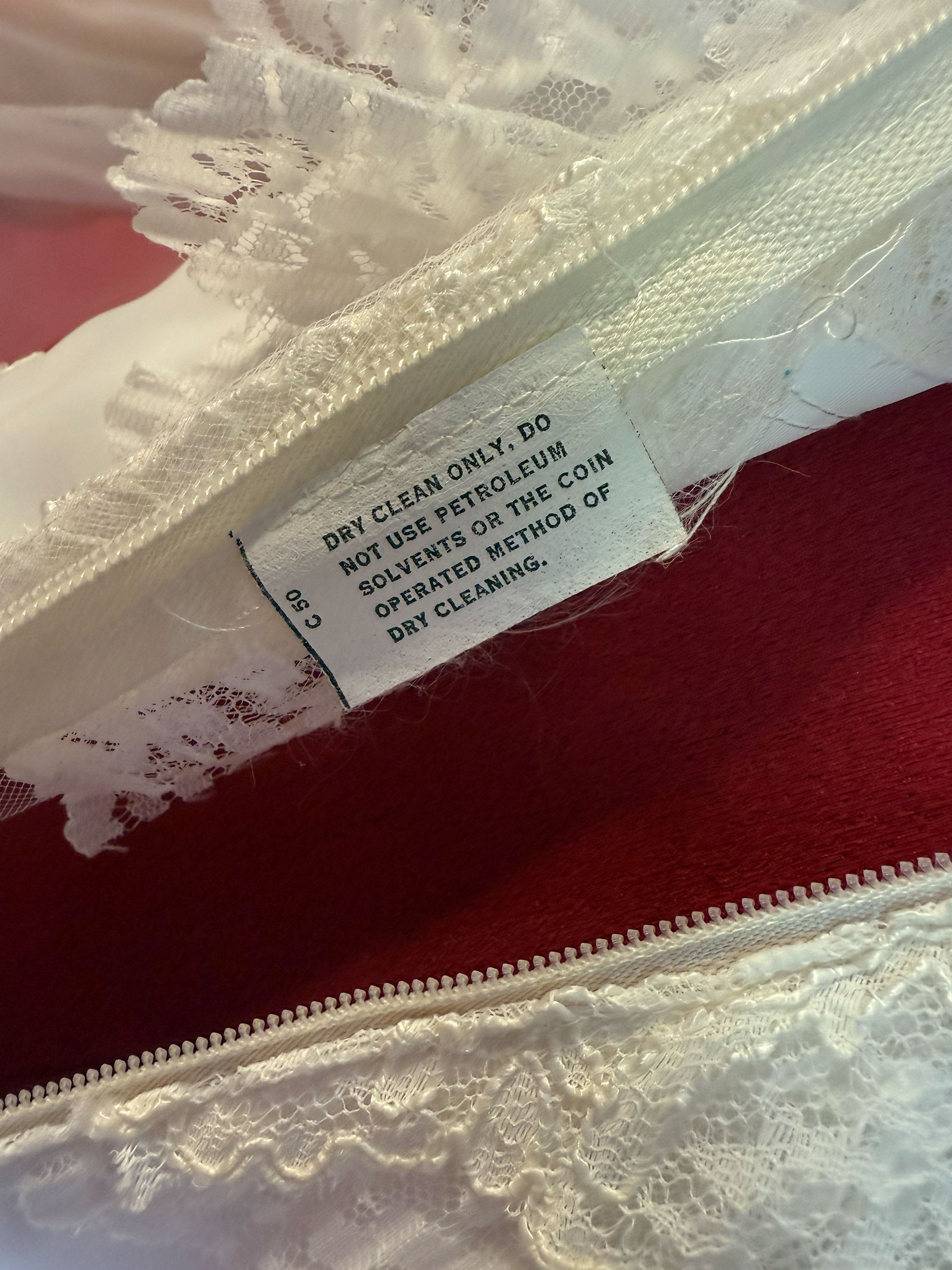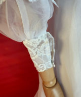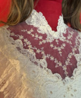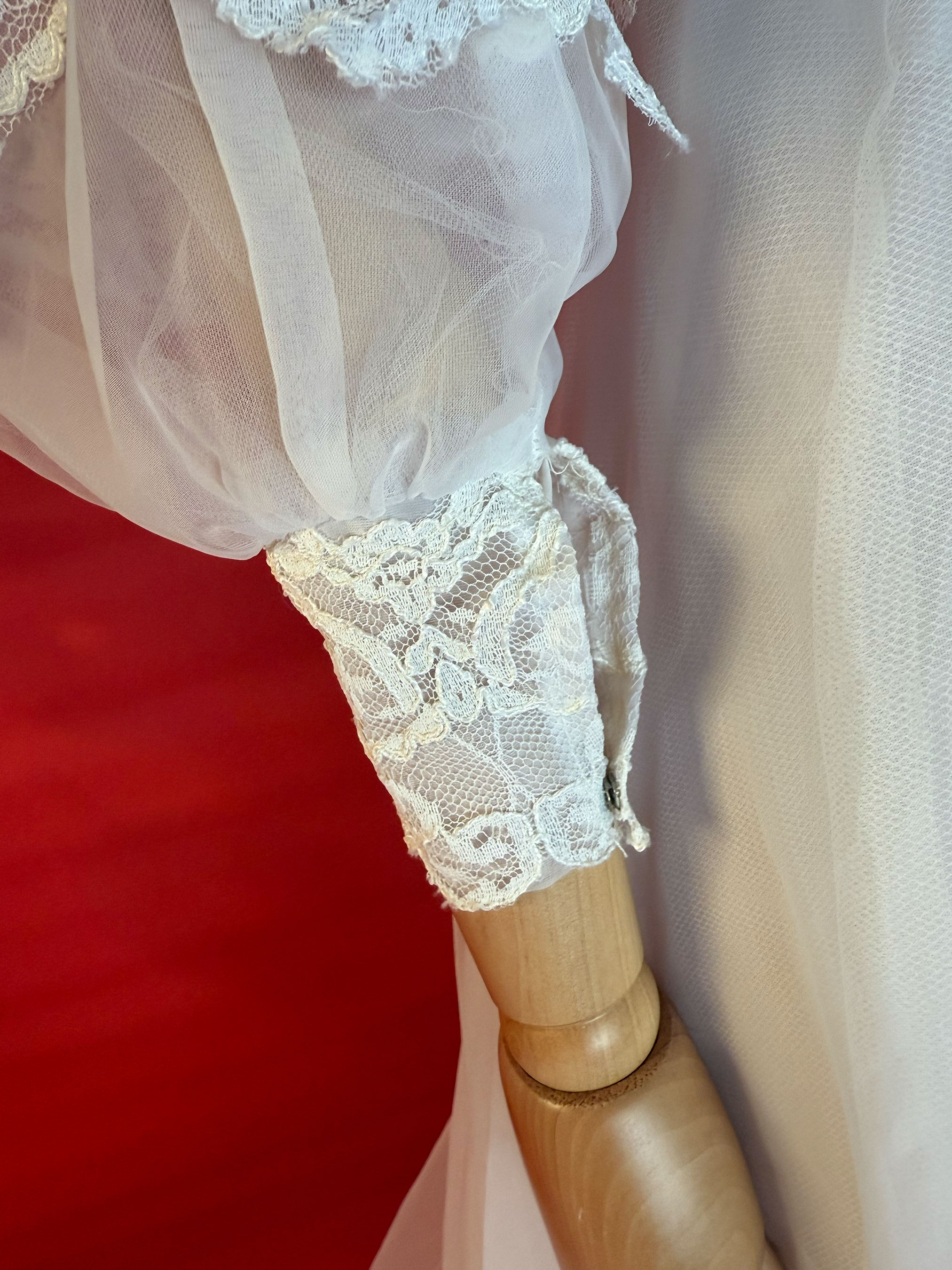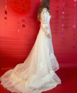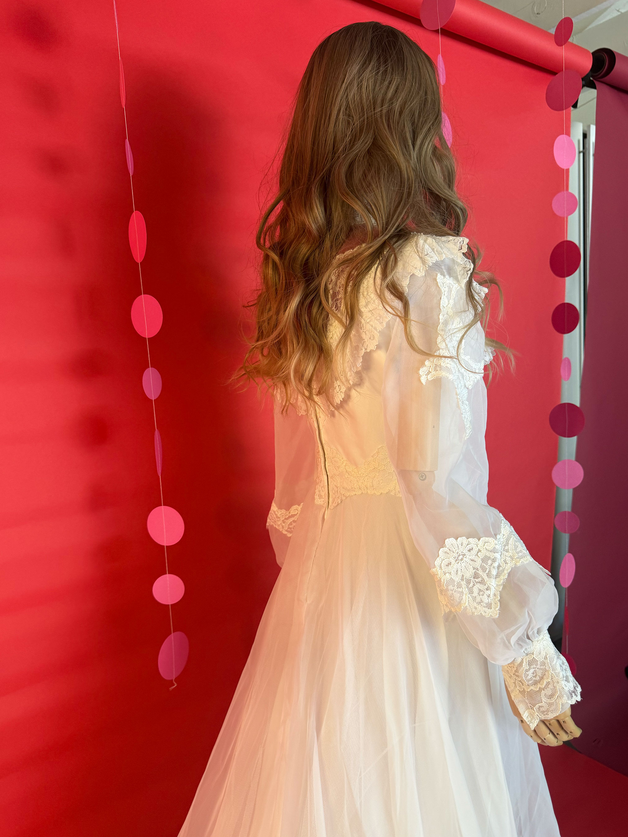 Say yes to a dreamy throwback. This 1970s lace gown brings main character energy with its pearl beading, dramatic train, and Victorian-inspired romance.